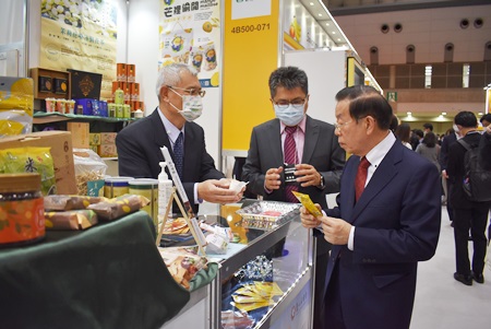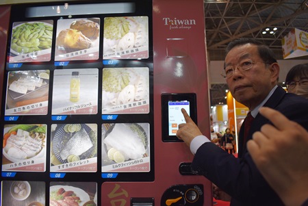 另外,會場中由農委會所規劃的「臺灣農漁產館」也舉行開幕式,由農委會副主委陳駿季在現場介紹臺灣冷凍農漁產的自動販賣機,謝代表並親自投幣在販賣機購買了冷凍燒番薯。