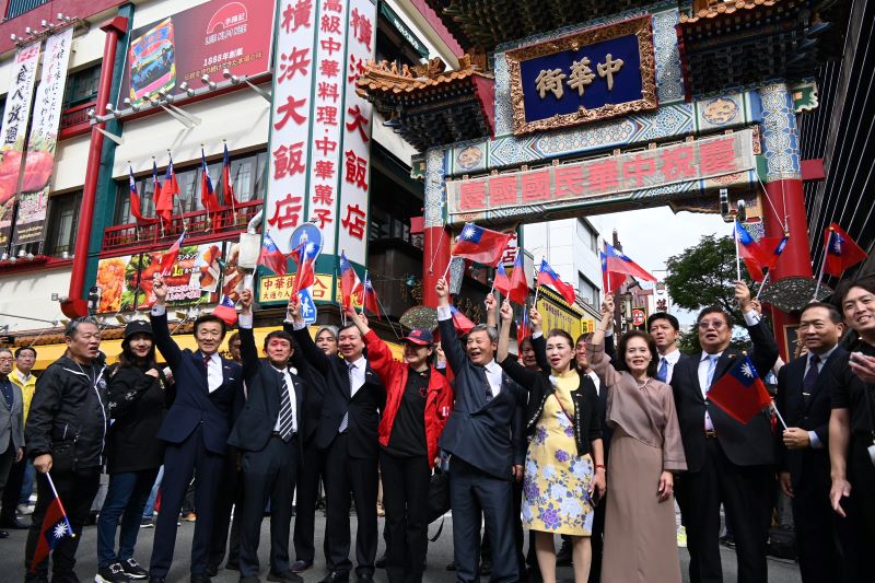 駐日代表李逸洋(前排左二)等於10月10日在橫濱中華街參加國慶遊行活動。駐日代表處橫濱分處處長張淑玲(前排右二)、橫濱華僑總會會長許耀庚(前排左一)及日本中華聯合總會會長羅鴻健(前排右一)