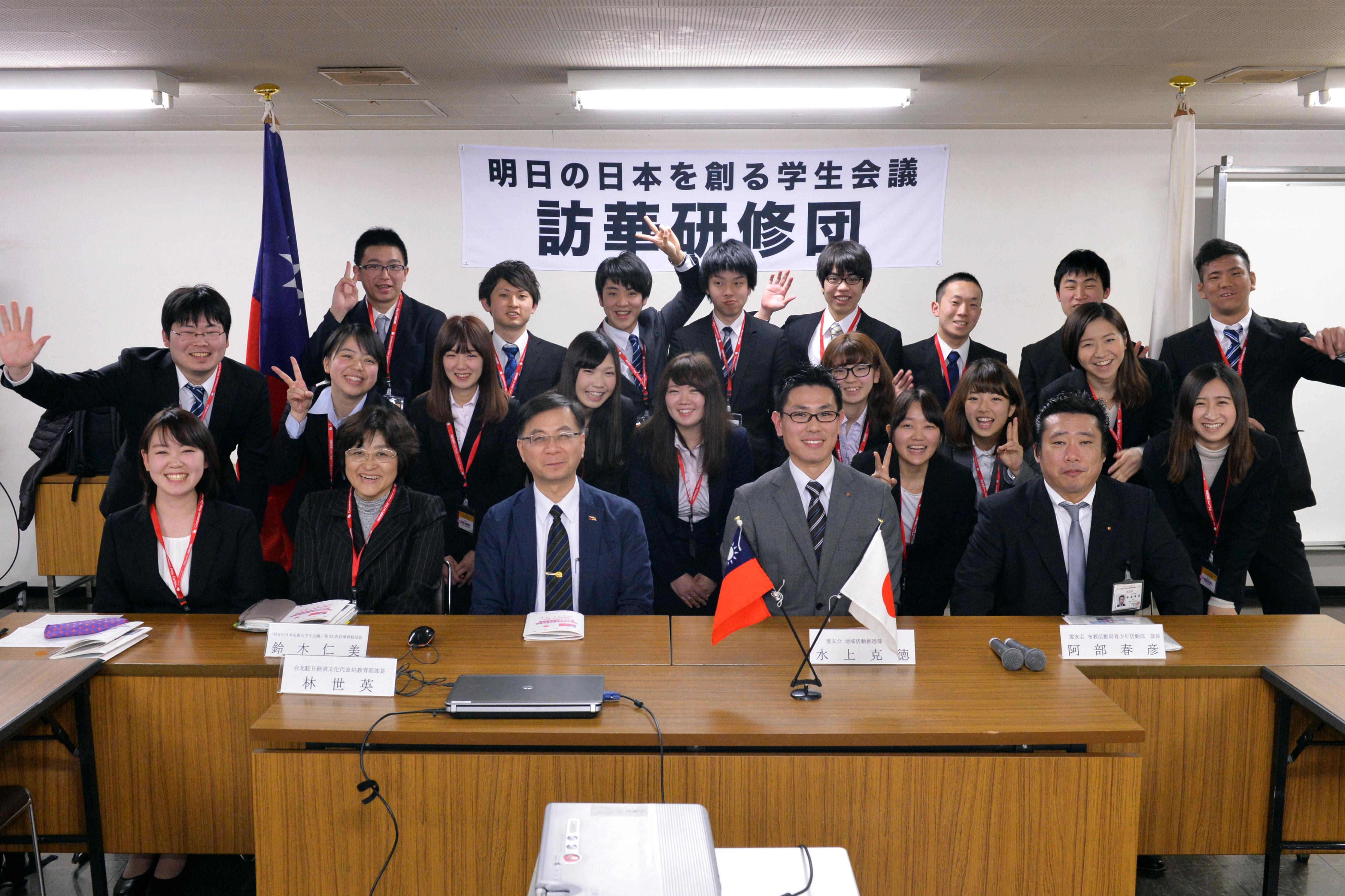 日本靈友會「創造明日日本學生會議」第33屆訪華研習團一行22名,於2月29日下午舉行訪華研習團結團;該團一行訂於105年3月1日至8日訪臺研習交流訪問。 駐日本代表處教育組林組長世英應邀出席結團式,說明臺灣基本資料及臺日關係等,以期增進日本學生對臺認識;同時,林組長也介紹駐日代表處近年來推動臺日青年學生活動及「臺灣日本學生會議」、「日本學生會議所˙日本臺灣論壇」、「臺日文化青少年獎學金」及「高中生國際教育旅行」等臺日青年交流資訊。 林組長鼓勵參與訪華日本青年學生,經由與臺灣青年學生交流及參訪臺灣相關大學,同時體驗接待家庭生活及參觀訪問,進一步理解臺灣教育體制及社會、體驗臺灣生活,同時與臺灣青年學生成為好朋友,多學習華語,相信日後一定可以共同為發展臺日友好關係做出最大的努力。 這次訪華研習團計有來自甲南女子大學、明治大學、亞細亞大學、文教大學、仙台高專、秋田大學、大東文化大學、筑波大學、德島大學、愛知淑德大學、山梨縣立大學、東京工業大學、日本大學、慶應大學、鳴門教育大學、三重大學、關西大學等大學生參加。 訪華研習團將與國立高雄第一科技大學、臺北城市科技大學及中國文化大學等3所大學學生進行教育研習交流及住宿接待家庭,體驗臺灣生活,增進臺日青年交流;同時拜會外交部亞東關係協會、中國青年救國團及參訪總統府、中正紀念堂、烏山頭水庫及八田與一紀念館、前往九份體驗臺灣風景。