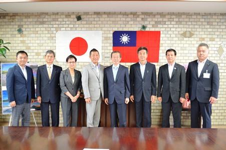 駐日本代表謝長廷(右4)訪問御殿場市區役所,與若林洋平市長(左4)合影。