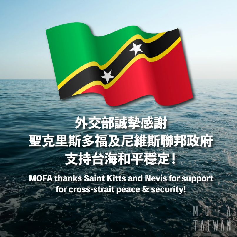 写真提供:外交部 セントクリストファー・ネイビス連邦政府は現地時間18日、台湾海洋の平和と安定への支持を表明する声明を発表した。同国では今月14日、国会が台湾の国際組織への参加を支持する決議を可決したばかり。中華民国(台湾)外交部は、セントクリストファー・ネイビス連邦政府が具体的行動をもって台湾海峡の平和と安定に対する揺るぎない支持の姿勢を示したことについて、「心から感謝する」とするコメントを発表した。