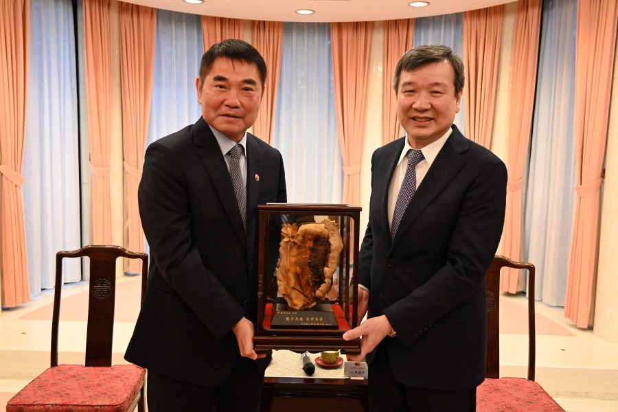 李逸洋・駐日代表(右)に鍾東錦・苗栗県長(左)から苗栗県の木彫り工芸記念品を贈呈