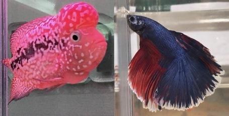 写真提供:中央社 台湾における観賞魚の養殖と研究開発で7割のシェアを誇る屏東県が観賞魚団体と協力し、今月10日から12日まで「第1回観賞魚普及国際交流品評会」を開催する。左はフラワーホーン・シクリッド、右はベタ。