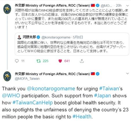 河野外務大臣は8日、「国際化の進展に伴い、世界的な公衆衛生危機対応の強化は不可欠であり、感染症対策等に地理的空白を生じさせないためにも、台湾がオブザーバーとしてWHO総会に参加することを、日本として支持します」とツイートした。外交部は同日、これをリツイートする形で、「河野外相が台湾のWHO総会参加を支持してくださったことに心より感謝します。日本の友人からの応援は、台湾のWHO総会参加が世界の健康安全保障にとっていかに重要で、また台湾2300万人の基本的人権が無視されていることがいかに不公平なことかを浮き彫りにするものです。本当にありがとうございます」と対応した。