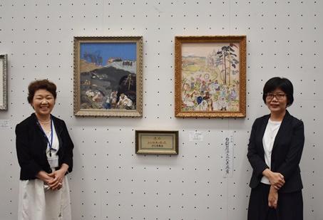 王淑芳・駐日代表処台湾文化センター長(左)、中村茂淑さん(右)。右上は中村さんの作品