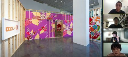 林明弘氏(右上1)、モデレーターの山本浩貴(右上2)、森美術館の片岡真実館長(右上3)がオンラインでアートイベントの国際出展と企画開催等の現代アートの核心的テーマについて対談した。