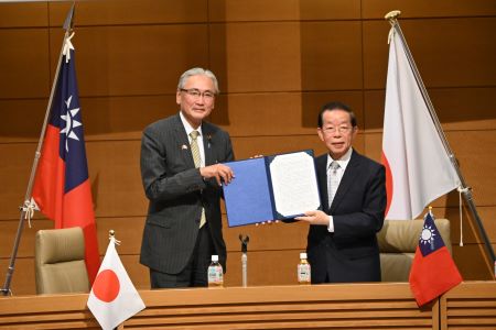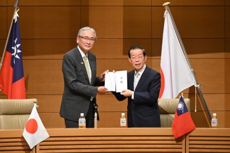 古屋圭司・日華議員懇談会会長/衆議院議員(左)から謝長廷・駐日代表(右)に「日華議員懇談会 2024年度基本方針」が手交された
