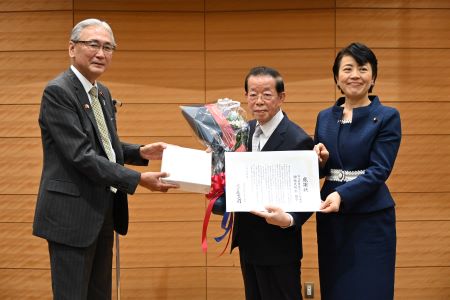 日華議員懇談会より謝長廷・駐日代表(右2)に感謝状と花束が贈られた