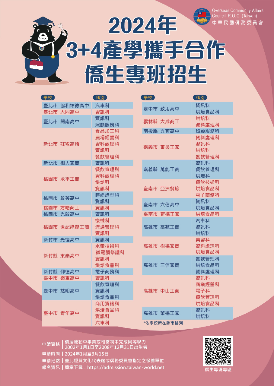 113學年度(2024年)海外僑生申請來臺升讀高級中等學校產學攜手合作僑生專班招生