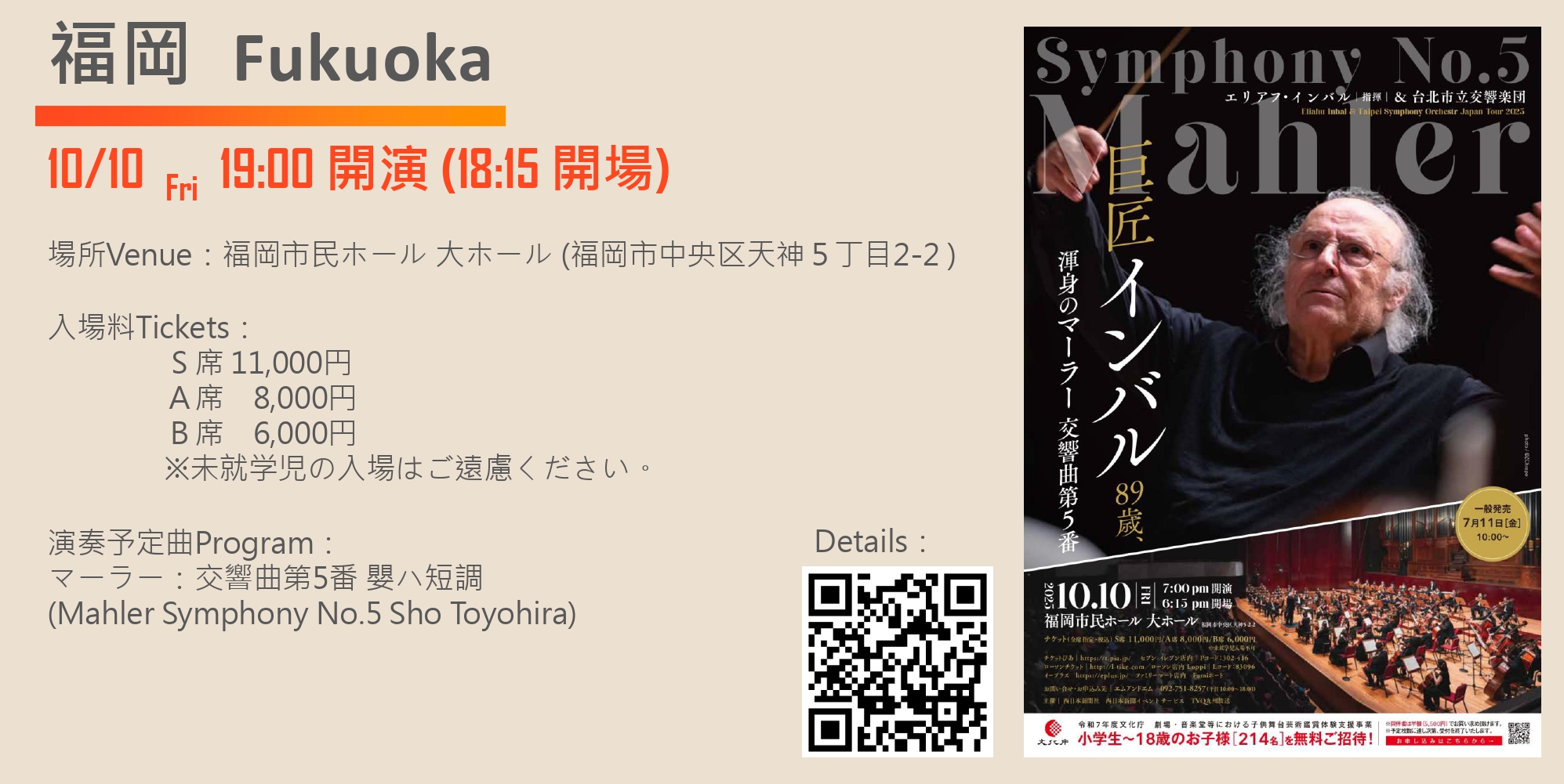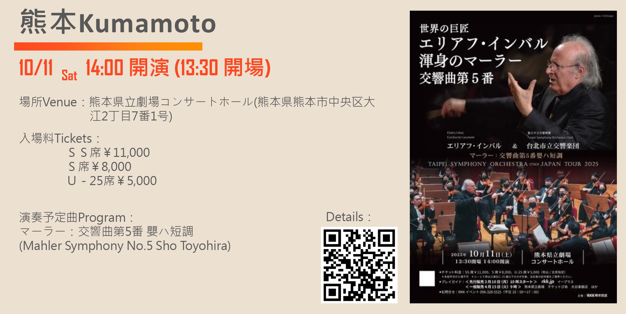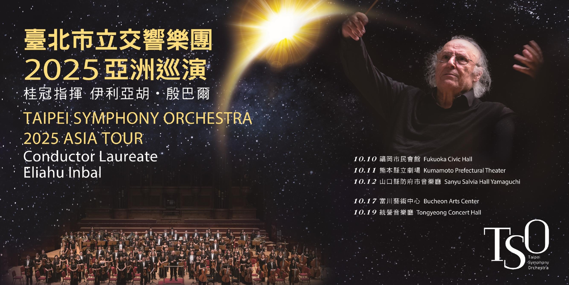 台北市立交響樂團(TSO)將於本(114)年10月10日至12日來日舉行2025年亞洲巡演,日本巡演日程及地點為10月10日於福岡市民會館、10月11日於熊本縣立劇場、10月12日於防府市音樂廳。本次亞洲巡演由現年89歲、享譽世界的國際知名指揮大師殷巴爾(Eliahu Inbal)親自率團演出,馬勒全集等曲目,歡迎進場聆聽。