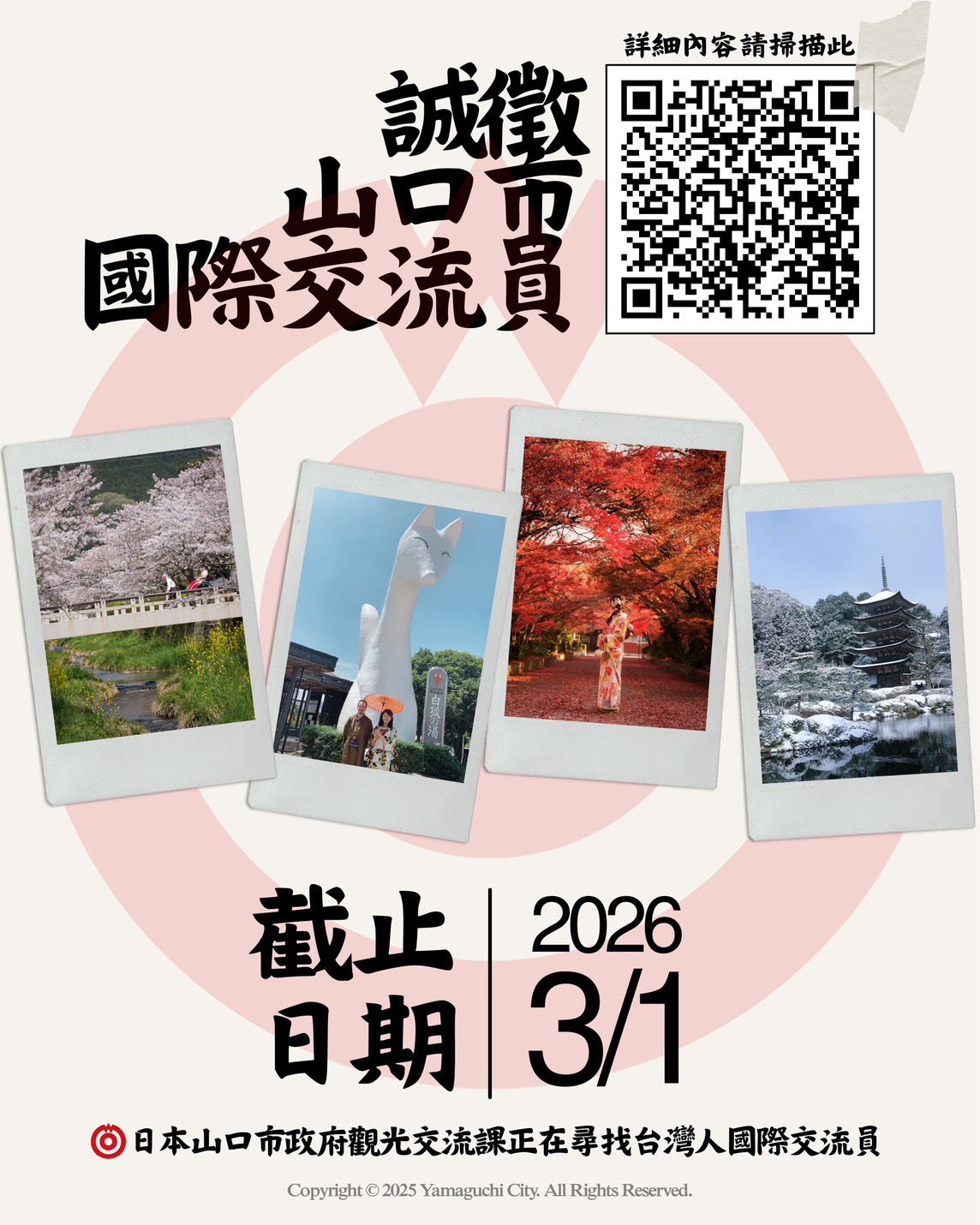 截止日期:2026年3月1日(週日) 詳細資訊:請掃圖片QRcode (https://www.city.yamaguchi.lg.jp/soshiki/21/186812.html)
