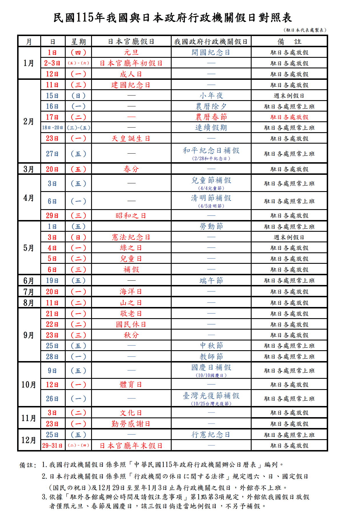 民國115(2026)年我國與日本政府行政機關假日對照表