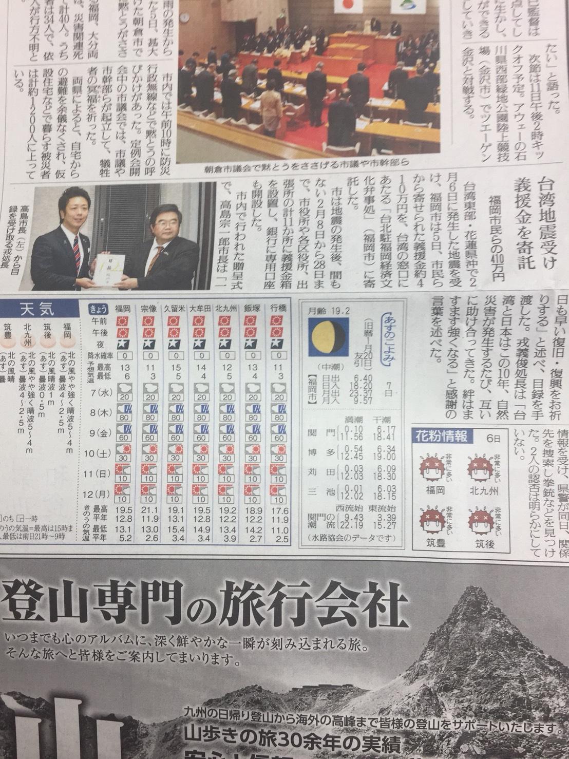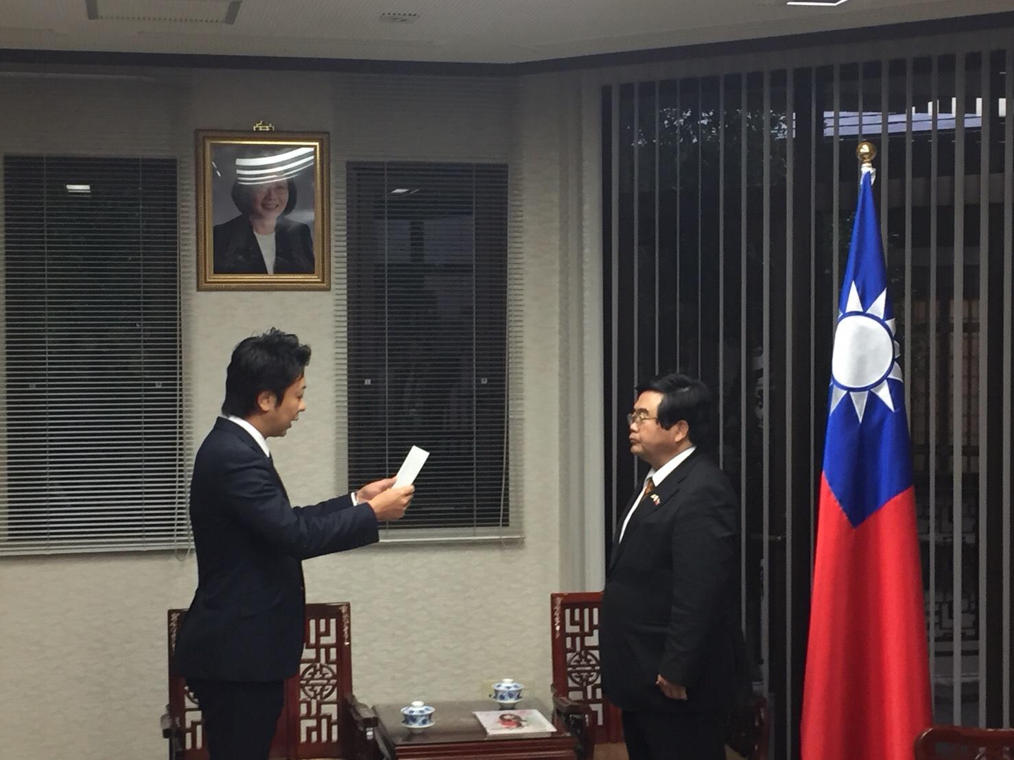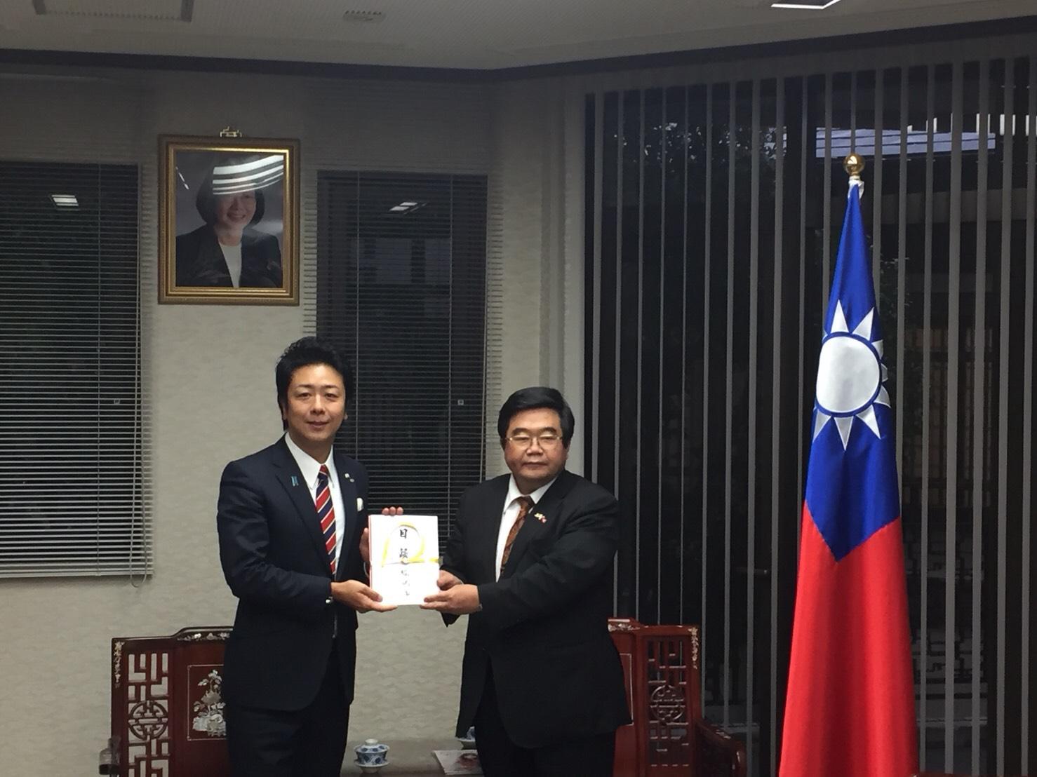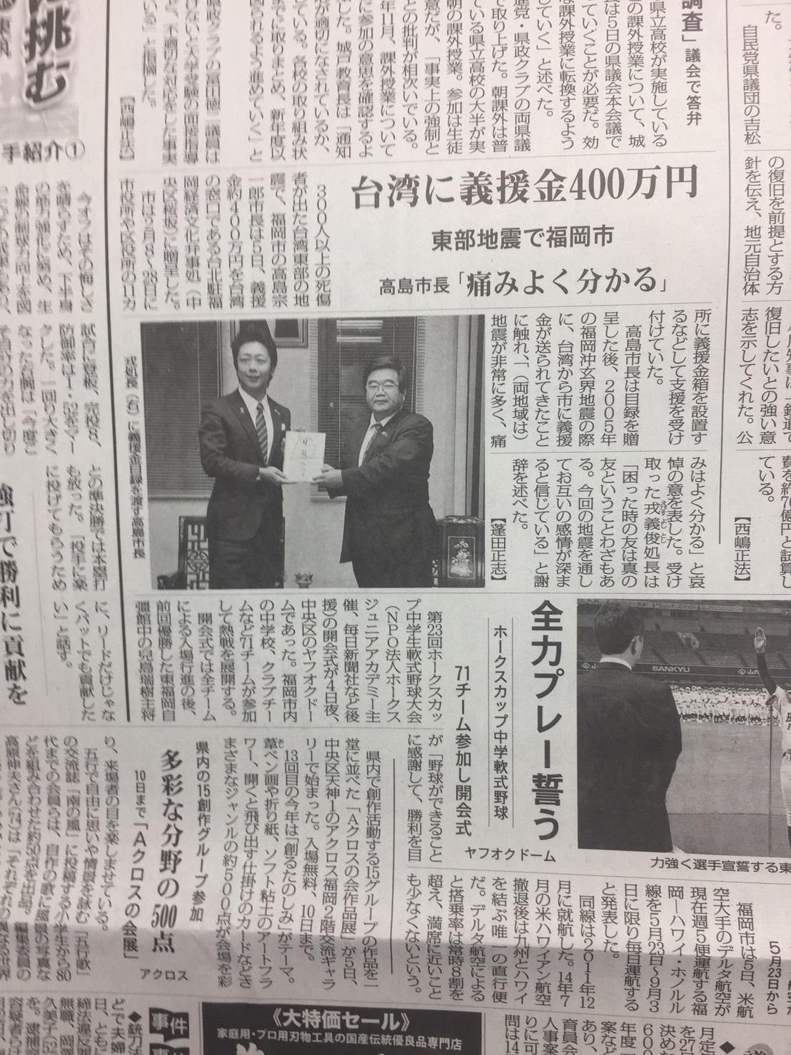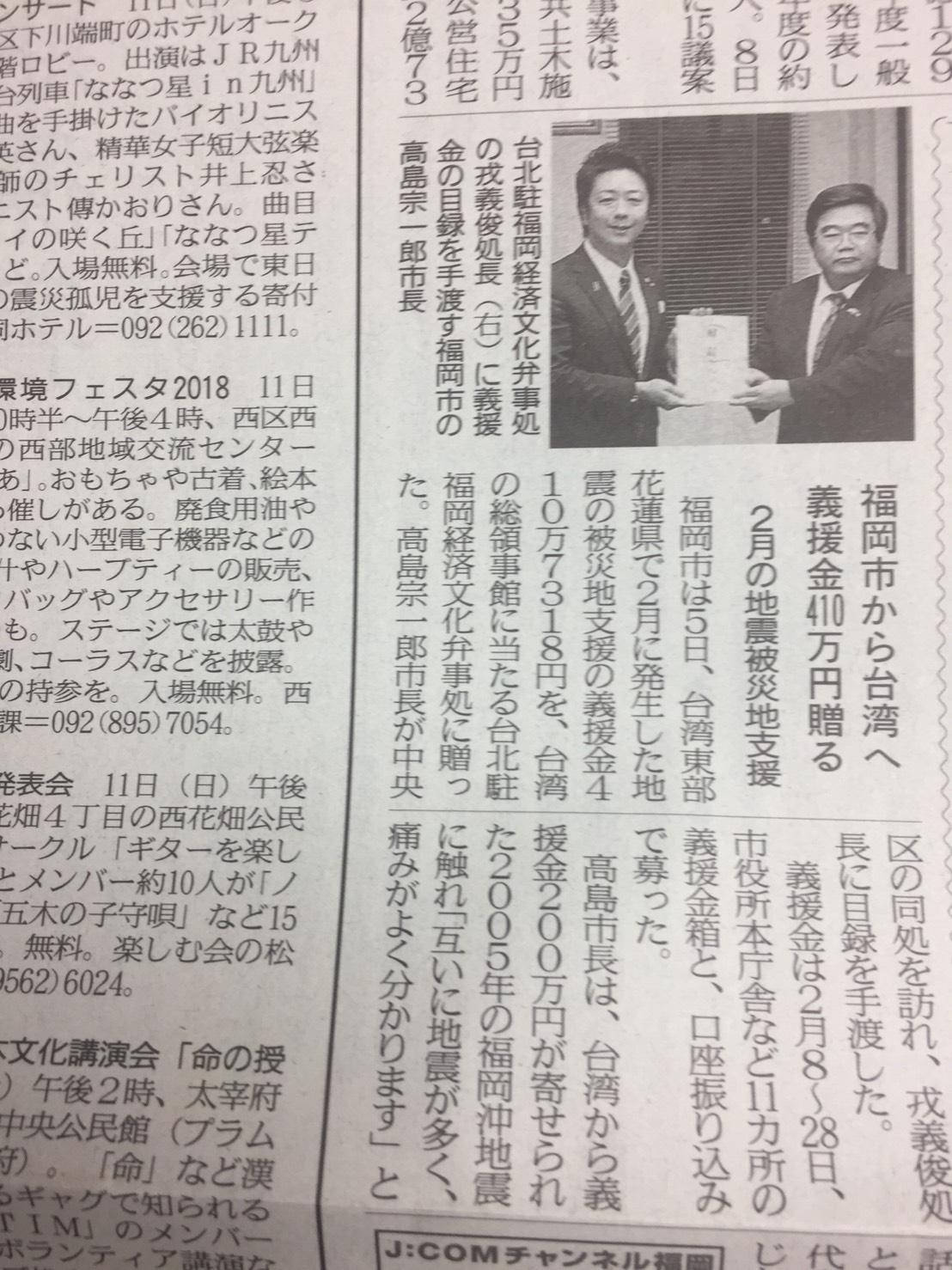福岡市長高島宗ㄧ郎在駐福岡辦事處捐贈花蓮震災義援金 3/5下午5:30人口157萬人的福岡市長高島宗ㄧ郎,首次蒞臨台北駐福岡辦事處,在十餘家媒體、電視台的鎂光燈見證下,親自將福岡市民捐贈的花蓮震災義援金410萬日圓交予戎義俊處長,並表示7年前日本東北震災時,感謝台灣人民的友情與溫暖,提供高額的捐款,日本國民至今難以忘懷。對此次花蓮震災受害居民由衷表達慰問之意。戎處長回答:「まさかの友こそ真の友,患難見真情,日本與台灣近年來,每逢自然災害,相互救援,相互扶持,就防災、減災的意義而言;台日兩國實為「命運共同體」,欣見目前台北市與福岡市交流合作密切,人民觀光及文化、經貿互訪頻繁;對高島市長政務繁忙,日理萬機中,仍抽空親自蒞臨,表示至深的謝意」。 戎義俊 2018.3.6