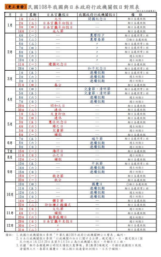 民國108年我國與日本政府行政機關假日對照表