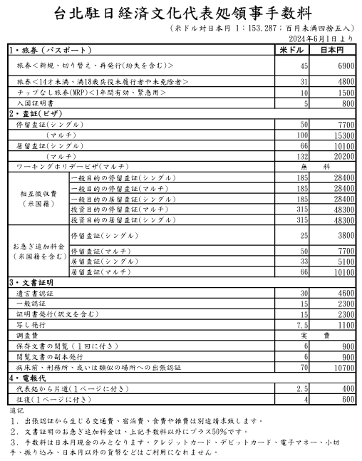 本処領事手数料は外交部領事事務局の指示により、2024年6月1日から(郵送申請の場合は本処受取日を基準とする)為替変動に基づき1ドル=153.287円となります。