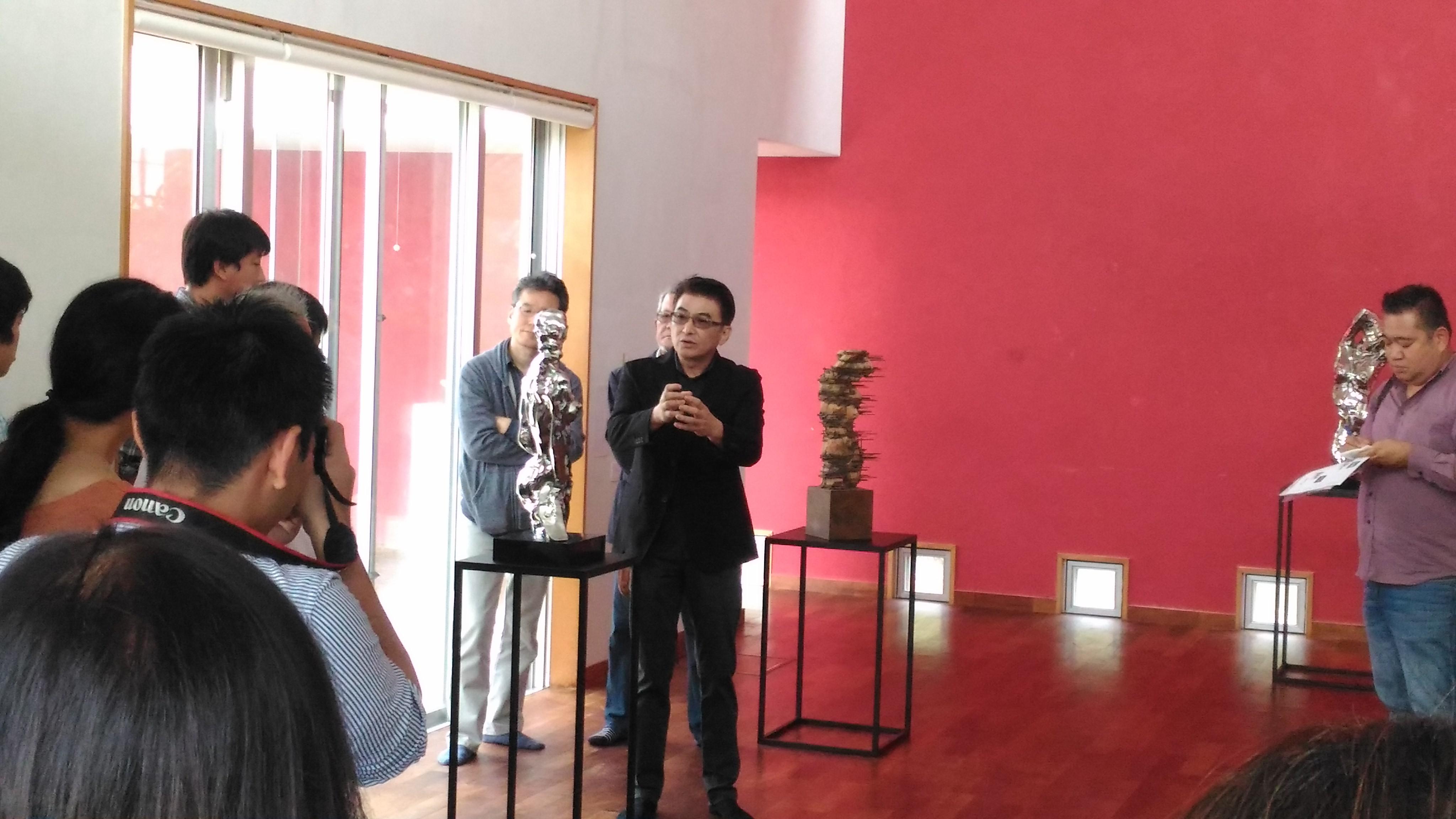 照片2:臺灣雕塑家余連春先生(中立者)向在場出席者說明作品創作歷程。