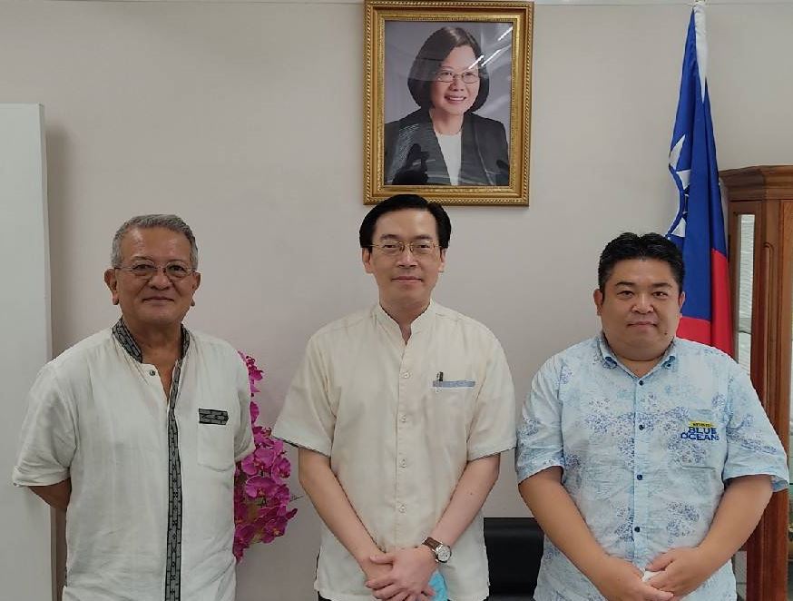 2021/05/07「琉球ブルーオーシャンズ」独立リーグプロ野球チームの北川智哉社長(右)及び沖縄台湾交流振興協会の平田久雄会長(左)が当処の范振國処長(中)を訪ね、琉球ブルーオーシャンズの我が国台湾の台湾プロ野球への加入の可能性について意見交換を行いました。