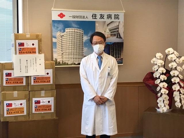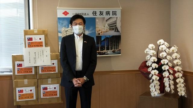 駐大阪辦事處李世丙處長於本(109)年7月21日上午前往大阪市住友醫院出席見證財團法人海華文教基金會吳明穎董事長捐贈醫療口罩儀式。一萬個醫療口罩由該基金會謝美香董事代表致贈,住友醫院金倉讓院長代表接受。