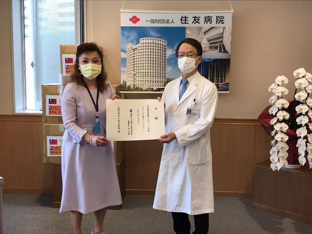 謝美香董事代表致贈(左)、住友醫院金倉讓院長代表接受(右)
