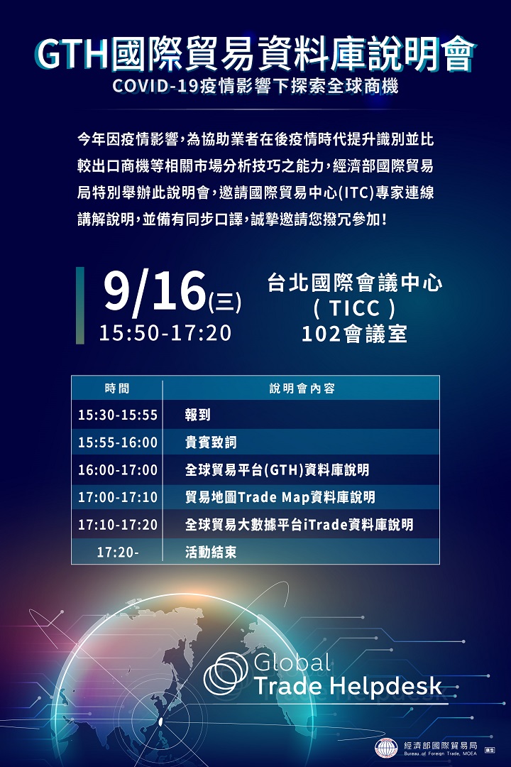 2020年9月16日於台北國際會議中心102會議室舉辦「GTH國際貿易資料庫說明會」