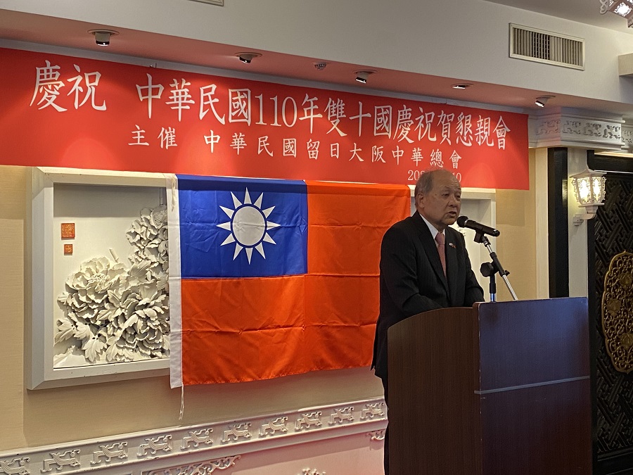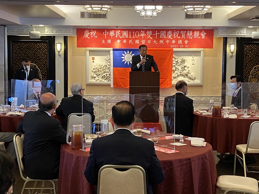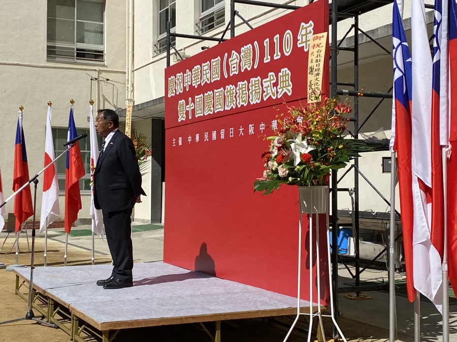 大阪中華總會於本(110)年10月10日上午在大阪中華學校操場舉行慶祝雙十國慶升旗典禮,駐大阪辦事處李世丙處長及同仁應邀出席共襄盛舉。出席人員包括大阪中華總會郭重信會長、洪里勝信名譽會長暨幹部、會員,以及轄區各僑會團陸超會長、俞秀霞總會長、上島彩會長、劉雯玲會長等多位僑領約150餘人。活動在會場高唱中華民國國歌揭開序幕,接續伴隨國旗歌,國旗冉冉在學校的屋頂升起,場面簡單隆重。