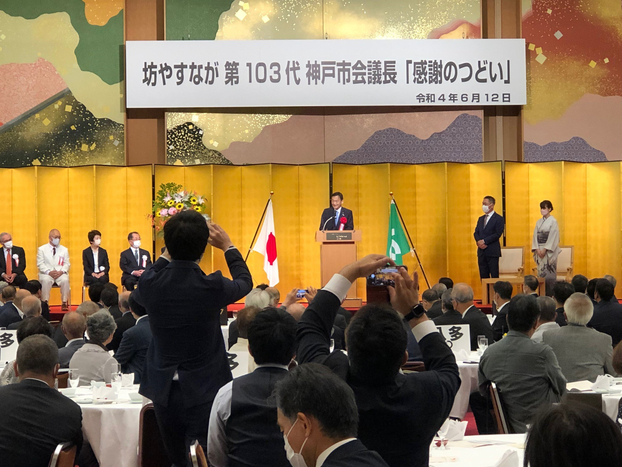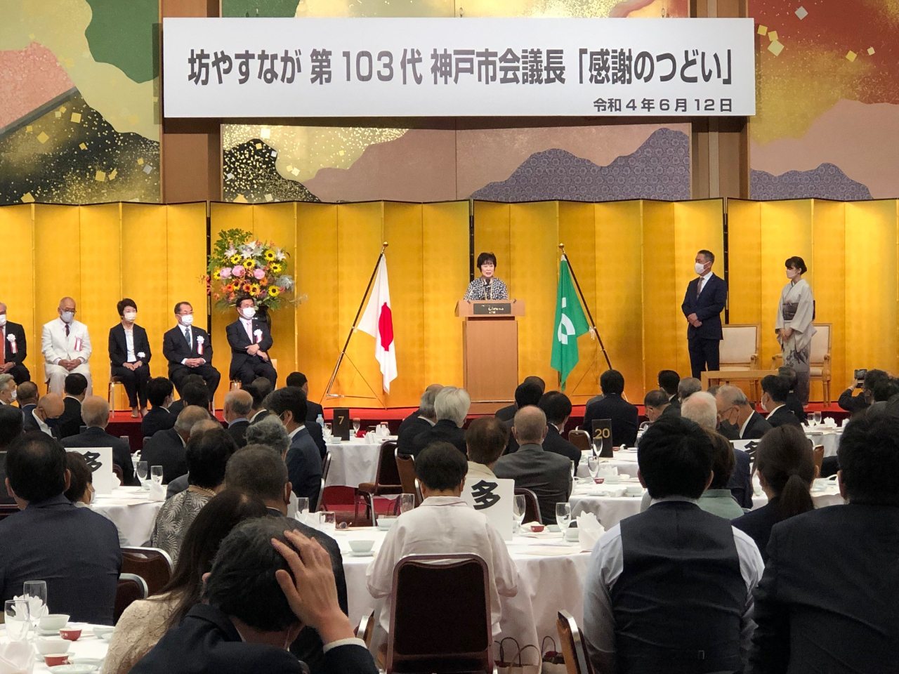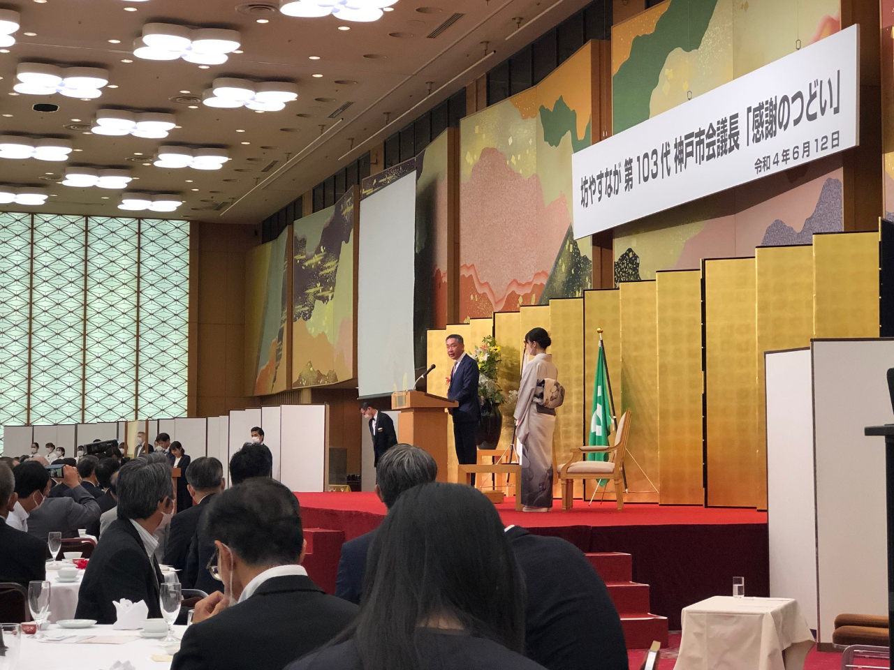 駐大阪辦事處向明德處長偕林明秋組長、楊慧萍秘書、林育柔秘書及李碧娟秘書於本(111)年6月12日出席神戶市議會坊恭壽議長感謝集會。