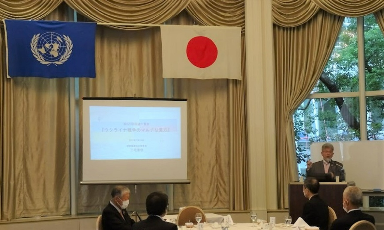 駐大阪辦事處向明德處長應邀出席聯合國協會關西本部於本(111)年7月28日舉辦之演講餐會,計有該會田嶋英雄本部長、倉智英吉副本部長、三宅善信理事長及大阪地區之金融、工商等各界代表近40名與會,三宅理事長以「烏克蘭戰爭之多元性看法」為題發表演講。該會成立於1951年,會員多為關西地區之政、經、文教界高層人士。