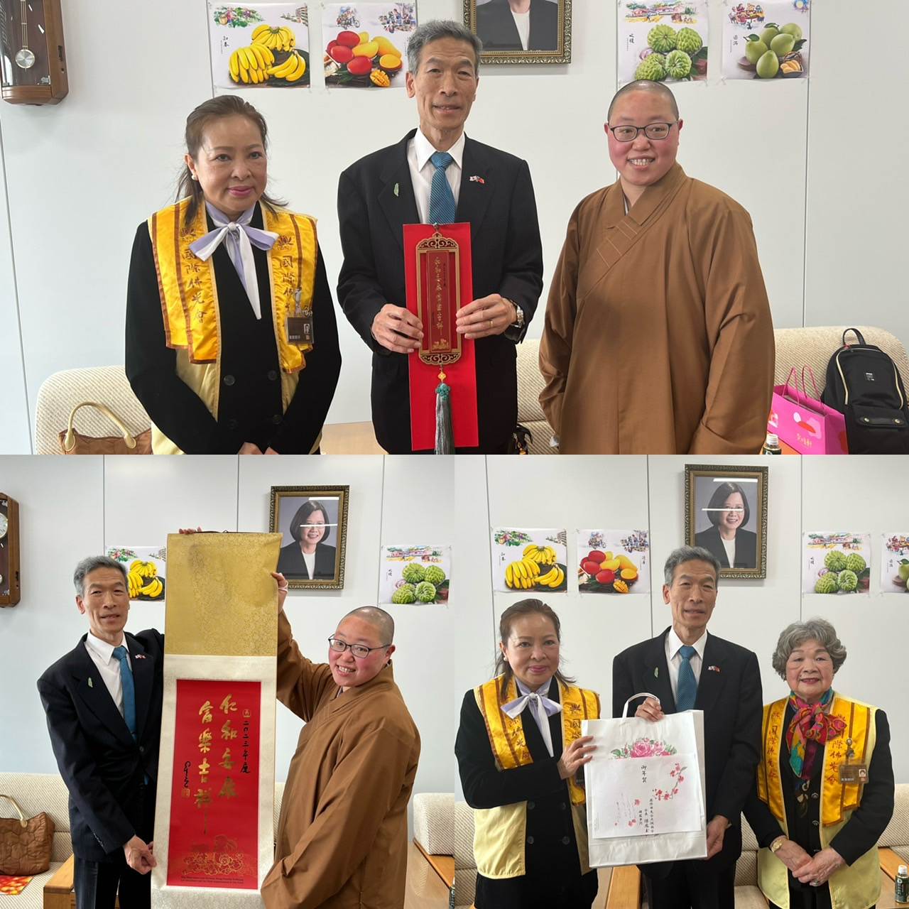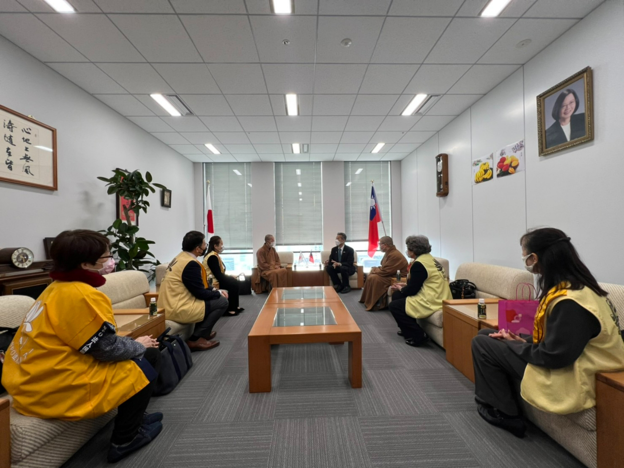 大阪佛光山副住職妙聖法師、如泉法師及知因法師、國際佛光會大阪協會陳鳳玉會長、張元禮子督導、松田振興督導等人於本(112)年1月13日來處新年拜會,由向明德處長接見,楊慧萍僑務秘書陪同。向處長感謝渠等平時協處國人急難救助案件,雙方亦就相關處理案例進行經驗分享。佛光山寺更準備平安符吊飾及星雲大師「仁和安康 富樂吉祥」墨寶掛軸等物品與辦事處結緣,期望大家都能平安健康。
