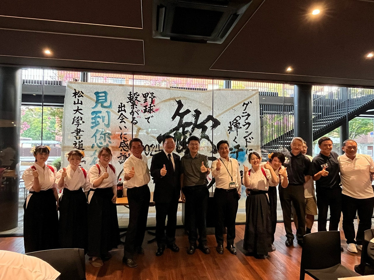 駐大阪辦事處洪英傑處長偕沈家銘秘書於本(113)年8月7日應邀赴愛媛縣拜會中村時廣知事,並出席「台日棒球交流峰會」。 國立嘉義大學棒球隊30位球員及松山大學棒球隊共計約150位學生參加「台日棒球交流峰會」。 洪處長表示,棒球是台日深厚友誼之象徵,百年前棒球從日本傳來台灣,迄今棒球已是台灣的國民運動。未來期盼透過兩地大學生之交流,讓嘉義與愛媛縣之友好關係持續下一個百年。
