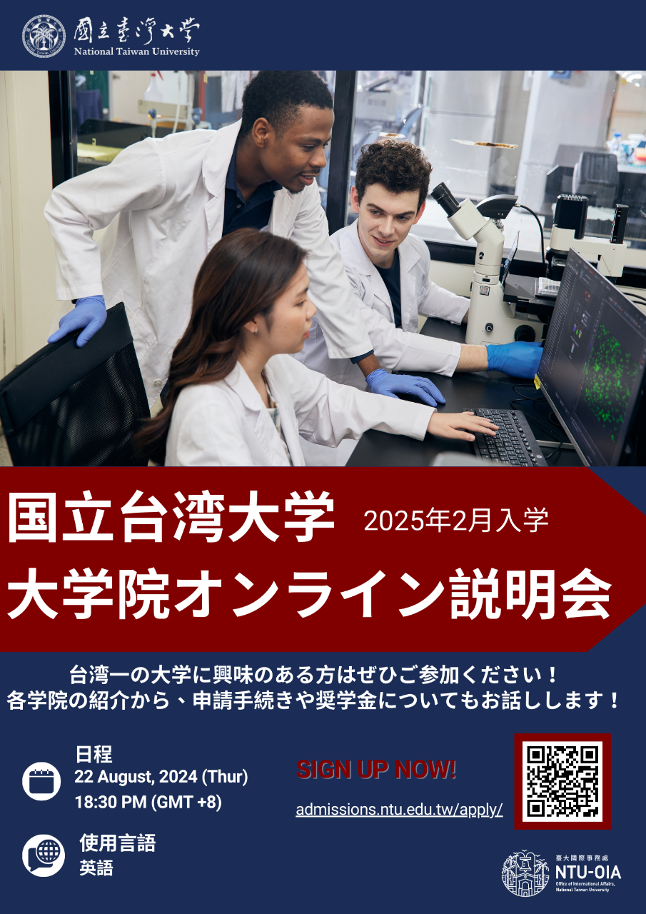 https://admissions.ntu.edu.tw/zh-hant/news/%f0%9f%93%a2-2025-graduate-february-entry-international-student-application-opens-on-august-5-2024/ それに先立ち、8月22日(木)には国立台湾大学に興味がある方を対象にオンライン説明会が開催されます。(事前申し込み制)