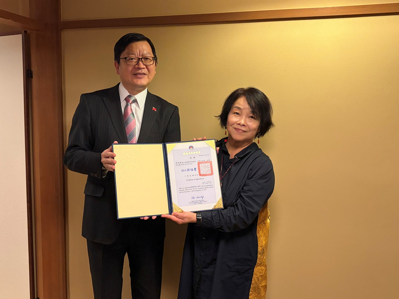 さらに、洪処長は僑務委員会を代表し、安田隆昌副会長および大嶋理絵副会長の両名に名誉職の委嘱状を授与した。両氏が長年にわたり僑務に尽力し、京都地域における僑界の発展と交流促進に多大な貢献を果たしてきた功績を称えた。
