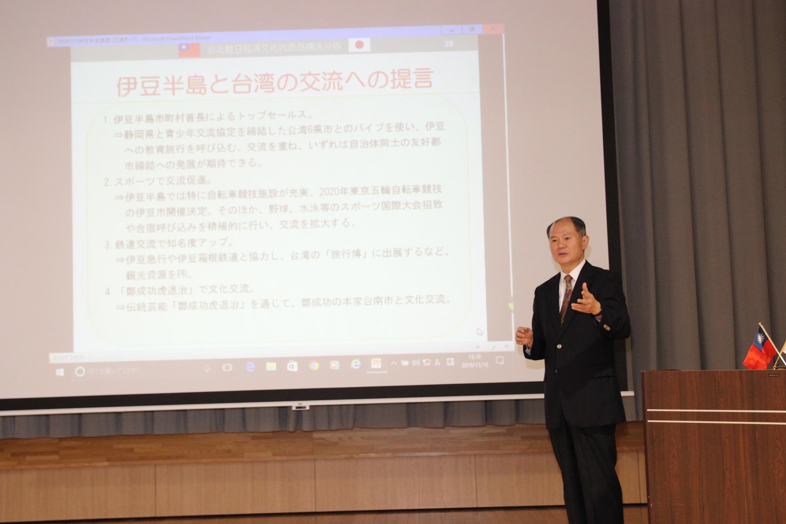 本處粘信士處長夫婦偕同仁於本(11)月16日至17日應靜岡縣議會友我議連會長森竹治郎邀請前往南伊豆町以「台日關係與地方交流」為題作專題演講,約有80餘人出席聆聽,期間並拜會該町及晚間出席當地懇親會,翌(17)日上午參訪當地避難高台等政經設施。