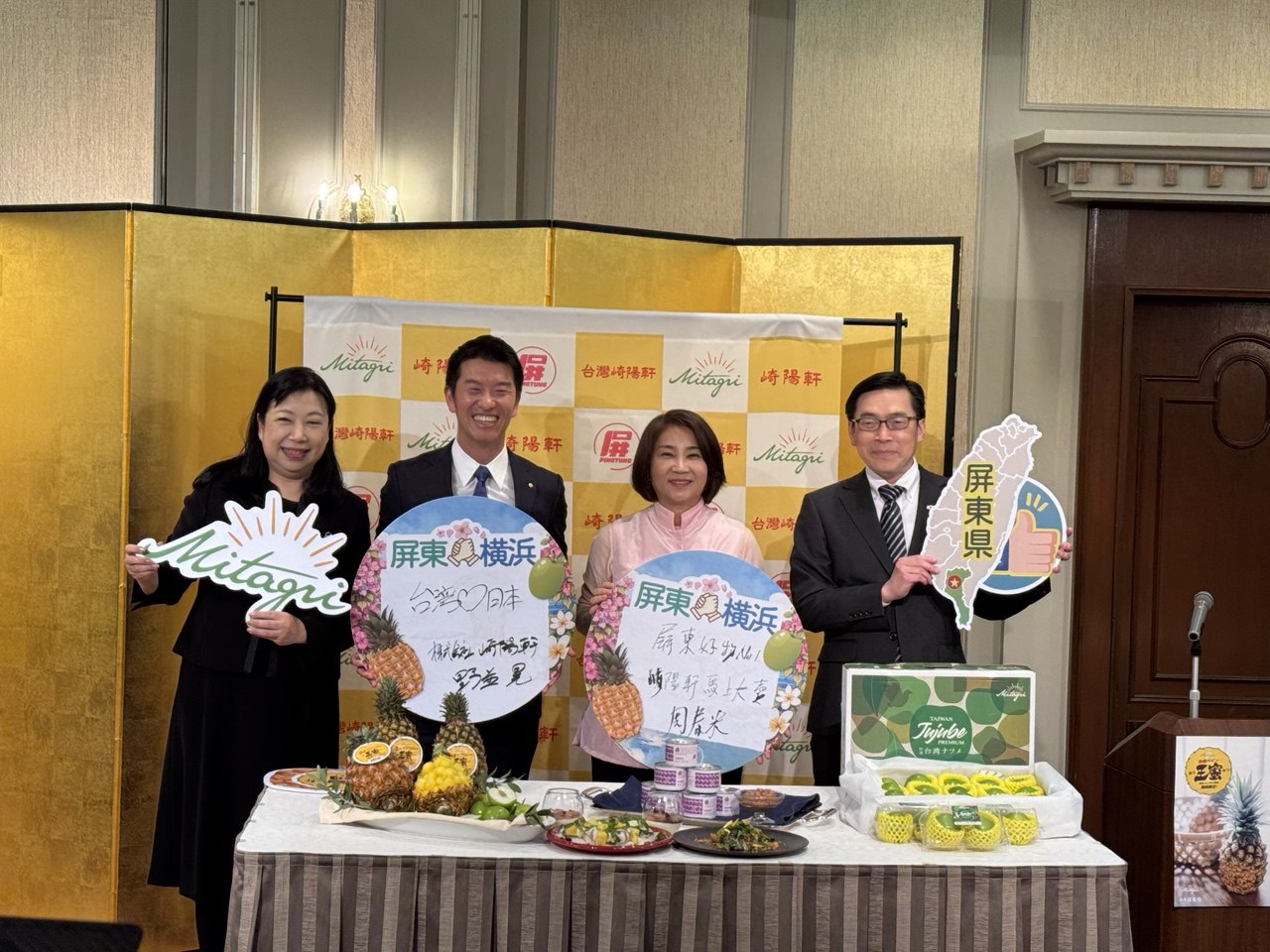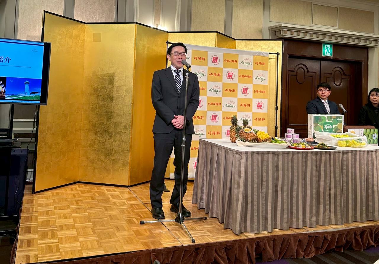 范處長致詞表示,台日互為彼此第三及第四大貿易夥伴,其中農產品交流十分密切,日本是台灣鳳梨、香蕉及芒果最大出口國,台灣則是日本蘋果、葡萄及草莓重要買家。屏東縣位處台灣最南部,是我國重要水果產地,產品品質十分優良,期盼藉由本次與日本崎陽軒合作,促更多日本民眾品嚐台灣優質農產品,並促進雙方農產交流。
