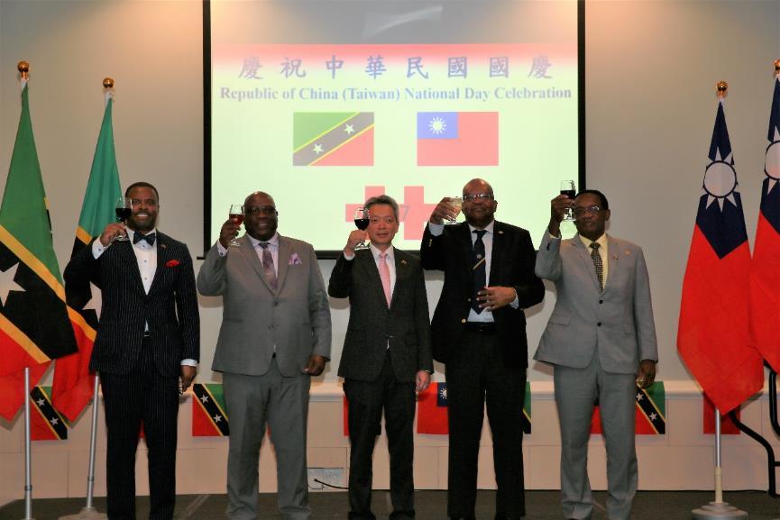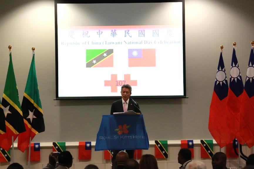 駐聖克里斯多福及尼維斯大使館於10月5日在克國皇家聖啟茨飯店(Royal St. Kitts Hotel)舉辦慶祝建國107年國慶酒會,酒會由李大使志強主持,克國總督席頓(Sir Tapley Seaton)、總理哈里斯(Timothy Harris)、副總理李察斯(Shawn Richards)、尼維斯島行政首長兼聯邦外交部長布蘭特利(Mark Brantley)、農業暨衛生部長漢米爾頓(Eugene Hamilton)、參議員兼國會副議長妮絲貝特(Akilah Byron-Nisbett)及夫婿、內閣秘書長哈菁絲(Josephine Huggins) 、尼維斯島副行政首長兼農業部長傑佛士(Alexis Jeffers)、勞工黨國會議員梅納德(Knoris Maynard)等政要,以及外交及領事團成員、克國政府各部會次長、資深官員、工商界與學術界領袖約200人參加。