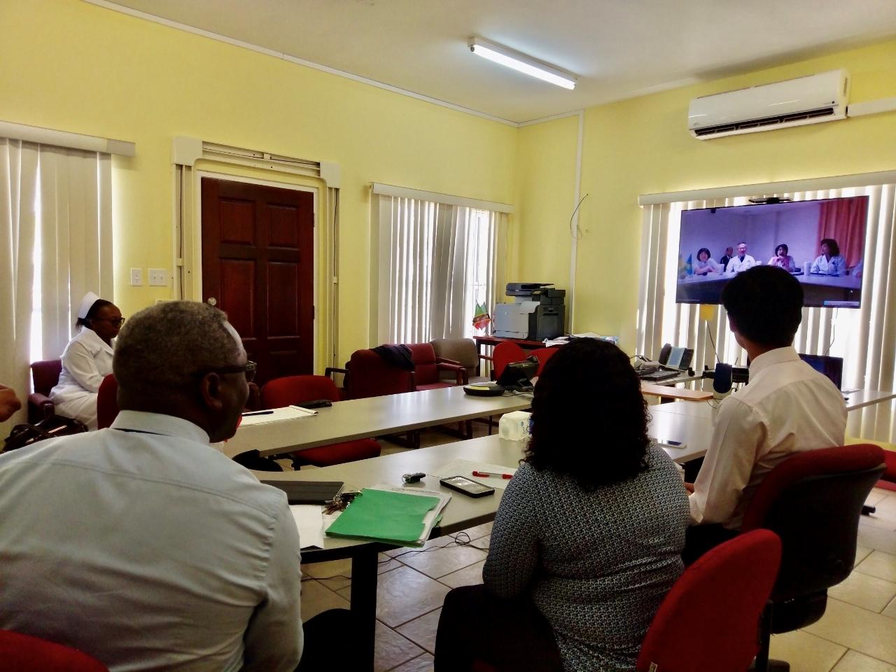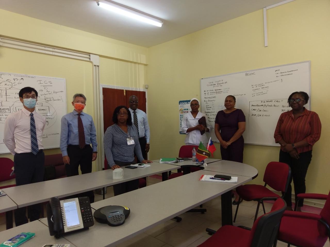 本館於330日協助辦理「奇美醫院與我加海友邦分享『嚴重特殊傳染性肺炎』(COVID-19)防疫經驗與措施視訊會議」,克國是由JNF醫院醫療長 Dr. Cameron Wilkinson 率領醫護主管及同仁與會,本館則由李志強大使率館團同仁出席這項在克國衛生部舉辦的交流盛會。參加這次會議的我邦交國除了克國之外,還包括貝里斯、聖露西亞及聖文森。