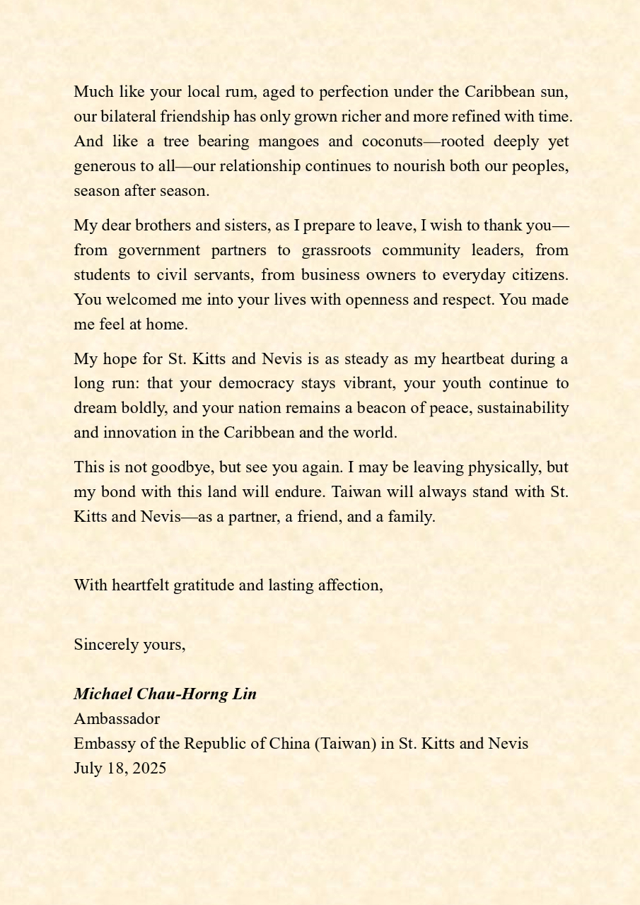 We are honored to share Ambassador Michael Chau-Horng Lin’s heartfelt Farewell Letter to the Brothers & Sisters of St. Kitts and Nevis.
