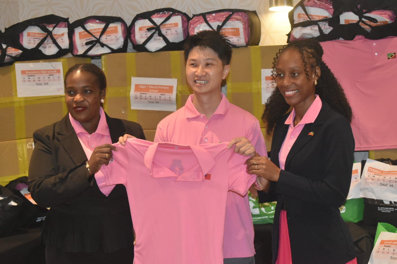 Second Secretary Hsien-Yu (Billy) Chung, representing Ambassador Edward Tao, attended the ceremony and congratulated the award-winning schools and all participants for working together to create a sustainable future. Secretary Chung also formally presented 1,600 eco-friendly T-shirts made from recycled plastics on behalf of the Embassy to the Hon. Dr. Joyelle Clarke, Minister of Sustainable Development, Environment and Climate Action and Constituency Empowerment of St. Kitts and Nevis, and Ms. Jahnel Nisbett, Minister of Health, Gender Affairs, and Social Empowerment of Nevis Island Administration.