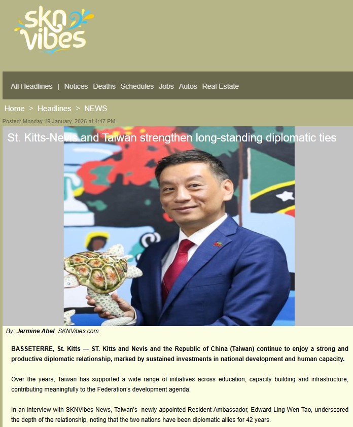 On January 19, SKNVibes published an interview with H.E. Edward Ling-Wen Tao, Resident Ambassador of the Republic of China (Taiwan) to St. Kitts and Nevis, highlighting the longstanding and robust diplomatic relations between the two countries.