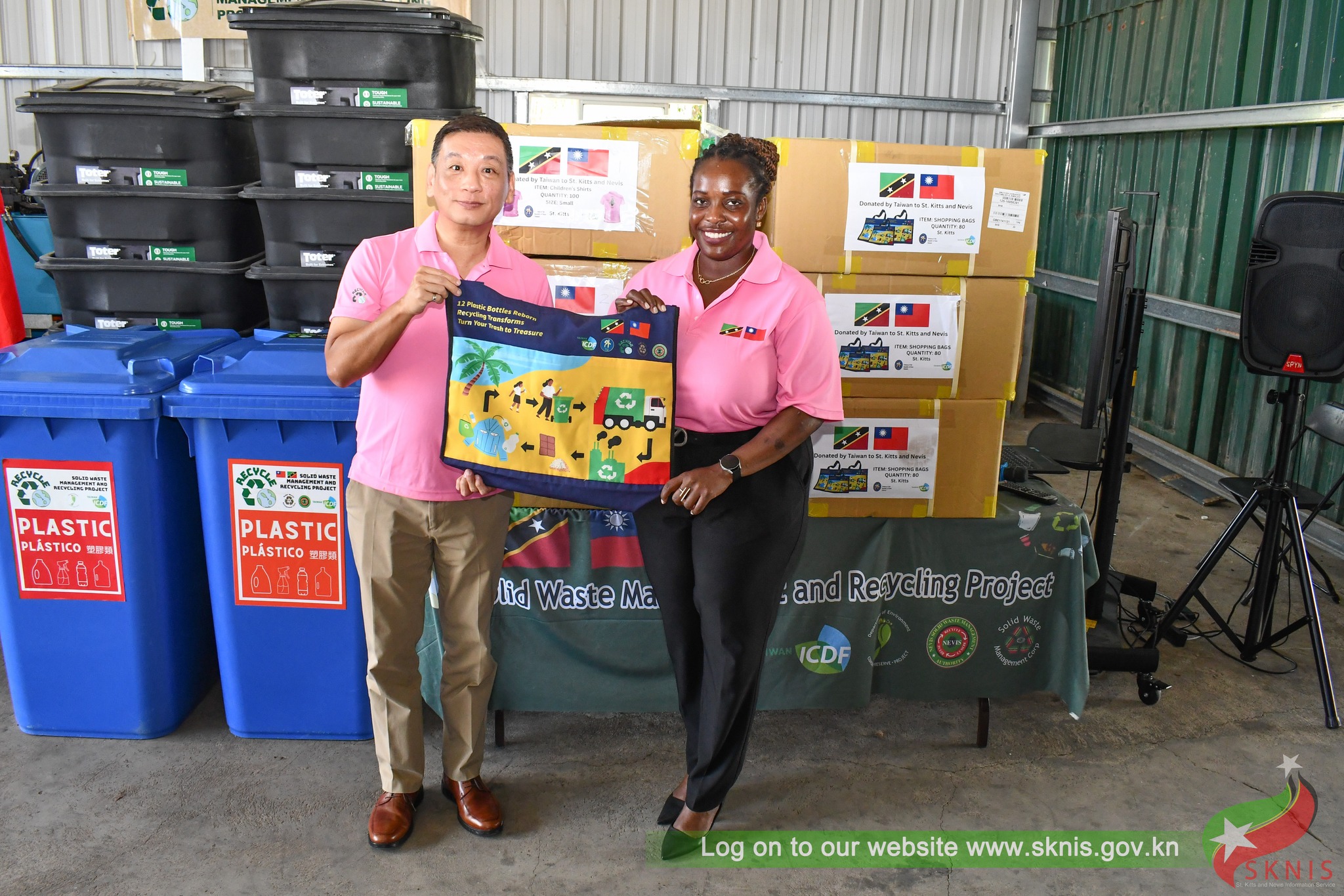During the ceremony, Taiwan donated 32 recycling bins to expand community recycling capacity, as well as 900 eco-friendly T-shirts and 400 reusable shopping bags made from recycled PET bottles collected in St. Kitts and Nevis—demonstrating the tangible outcomes of resource recycling.