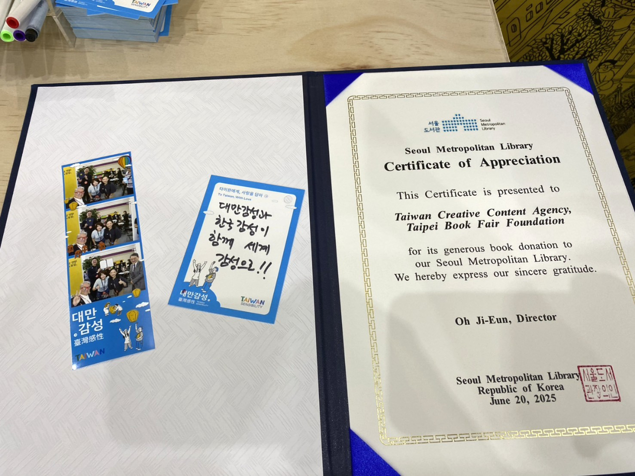 延續臺灣好書可以持續在韓國分享更多讀者的心意,今年2025首爾書展臺灣主題國如此難得盛事,其豐富且精彩的展覽精選書籍300餘冊於展覽結束後,捐贈300餘冊給首爾大都會圖書館,擴延至首爾書展200多家圖書館巡迴展示,將處處都成為台灣角落(Taiwan Corner)的美好示範,首爾大都會圖書館吳芝恩也表達未來也歡迎臺灣的作家到首爾大都會圖書館舉辦活動,更加深化臺韓多層次的交流。