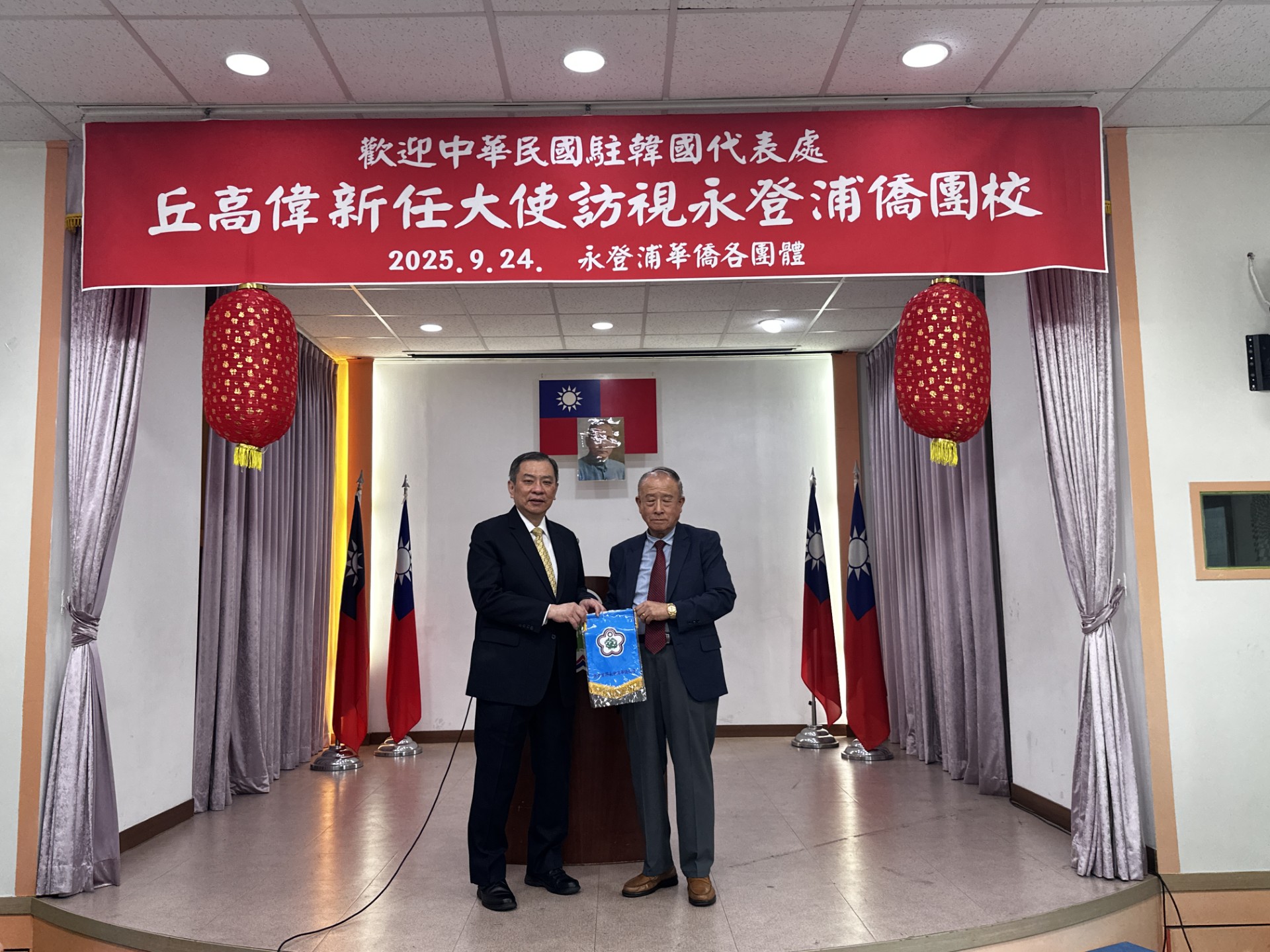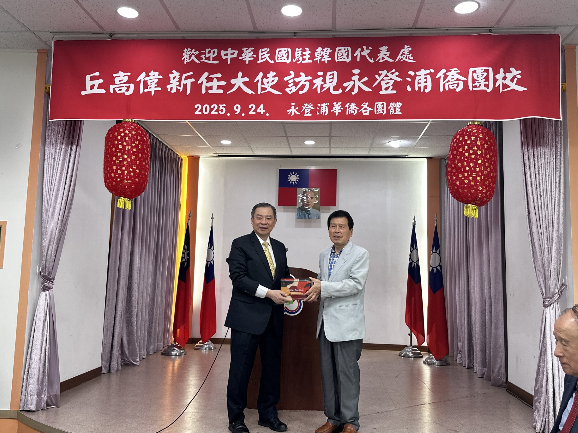 丘高偉代表致詞中提及自己外交生涯首派釜山,當時就對韓國華僑社會堅毅支持中華民國留下深刻印象!經歷三十多年因緣際會再次回到韓國服務,期盼與各地僑團校齊心合作,為韓國僑民創建更美好的未來。因應9月28日教師節即將到來,他也致贈臺灣風味禮品,以感謝永登浦華僑小學教師長年辛勞,讓正體華文教育在韓國札根。