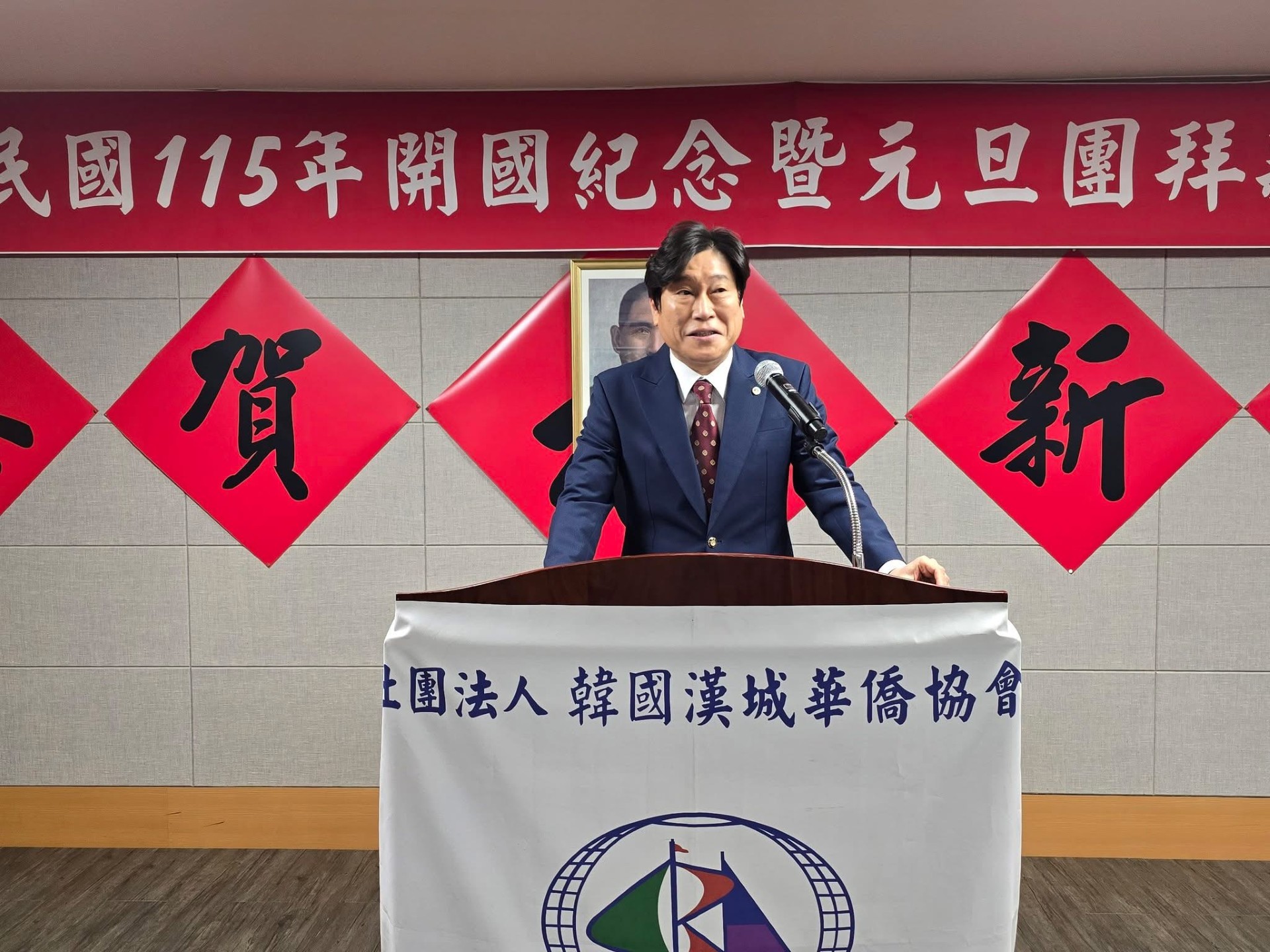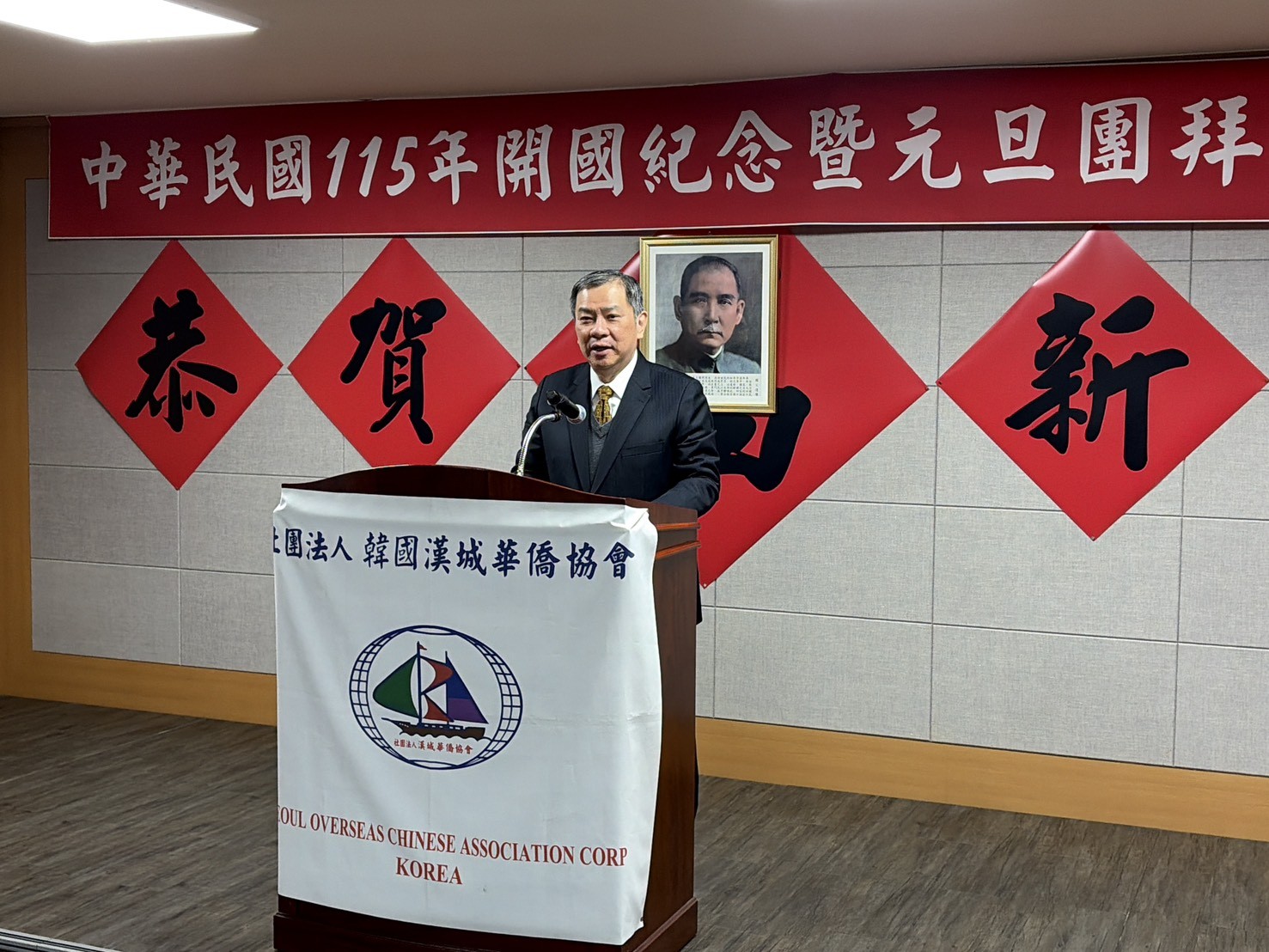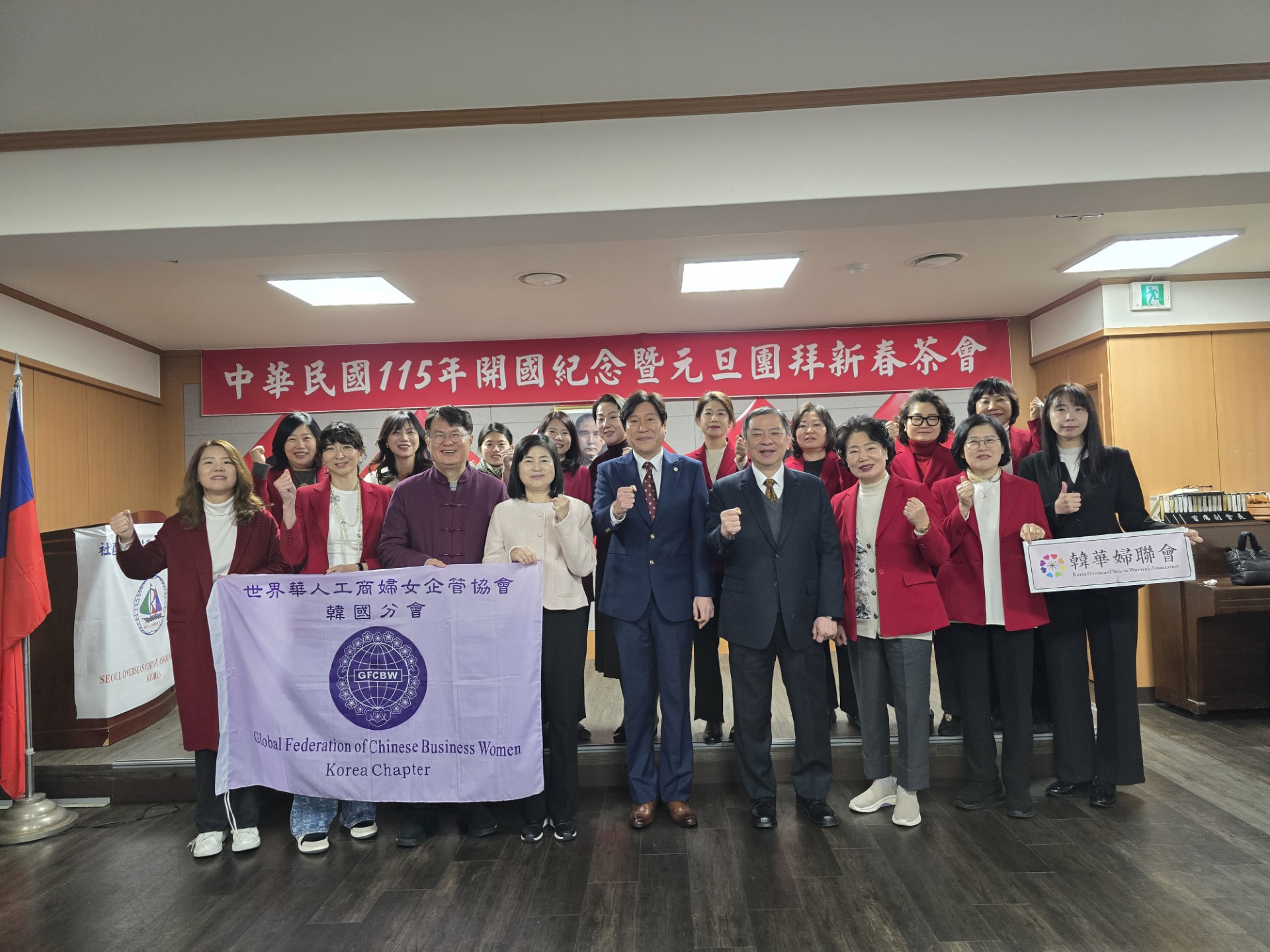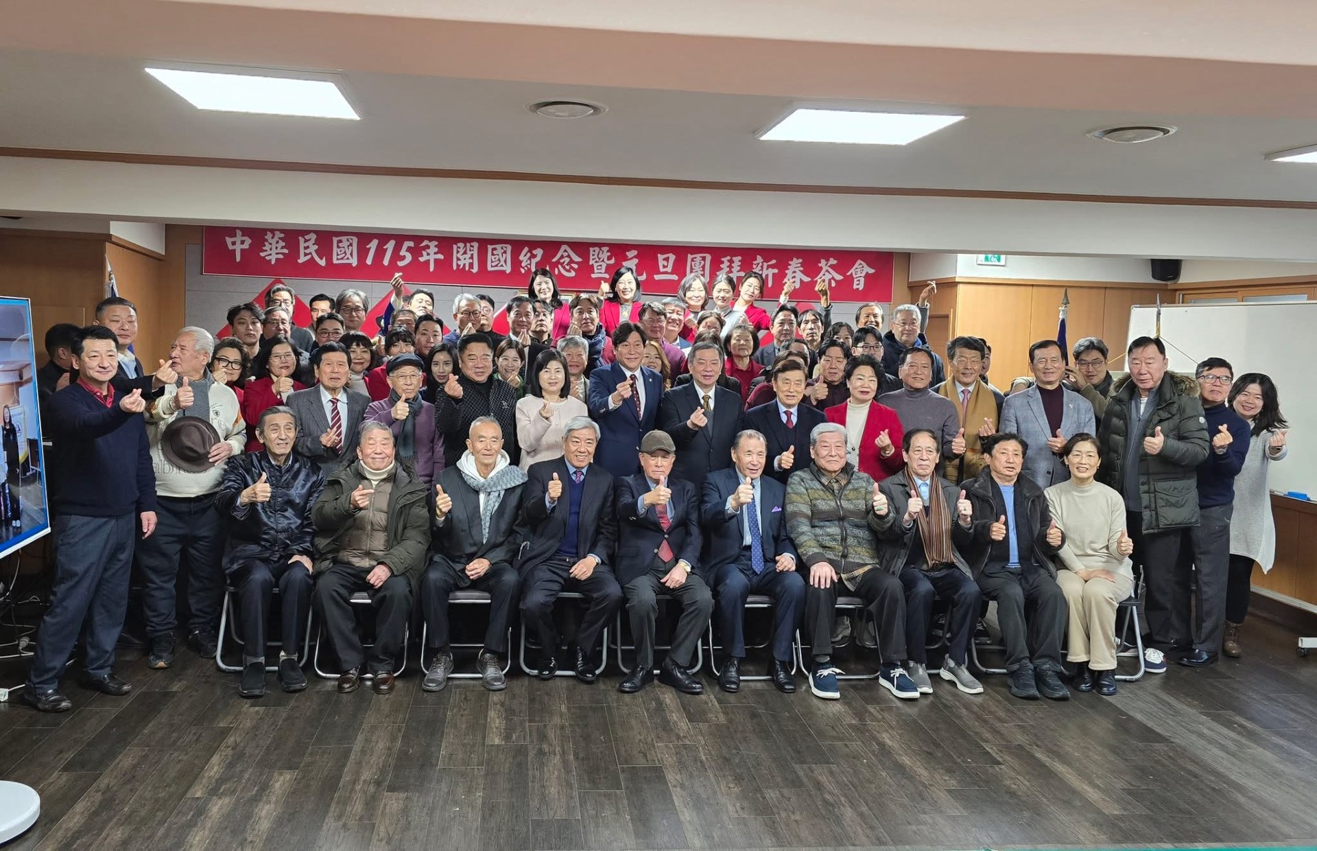 漢城華僑協會於元月一日上午舉行「慶祝中華民國115年開國紀念暨元旦團拜茶會」,由李中漢會長主持,駐韓國代表處丘高偉代表率領郭秋雯副代表及各組組長應邀出席,並有各地區僑團負責人、代表及僑校理事長、校長等約80餘人出席。