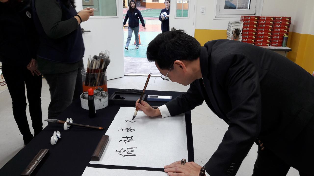 這是唐殿文大使就任後,首次到學校訪問,吳學彬理事長詳細為唐大使解說學校的環境、成立發展的歷史及未來的計畫。唐大使也應邀以毛筆字題詞”僑校基石”,呼應漢城華僑小學在韓國僑校中所扮演的重要地位。隨後唐大使也參觀學校的各項設施,並對僑小老師為僑教工作所盡心力表達欽佩與感謝之意。