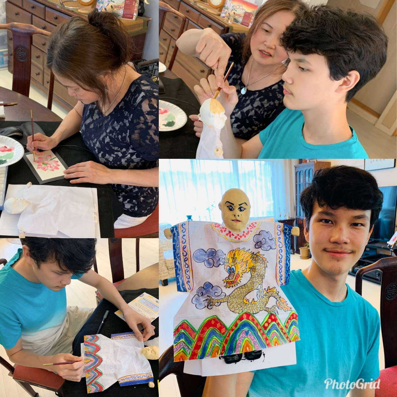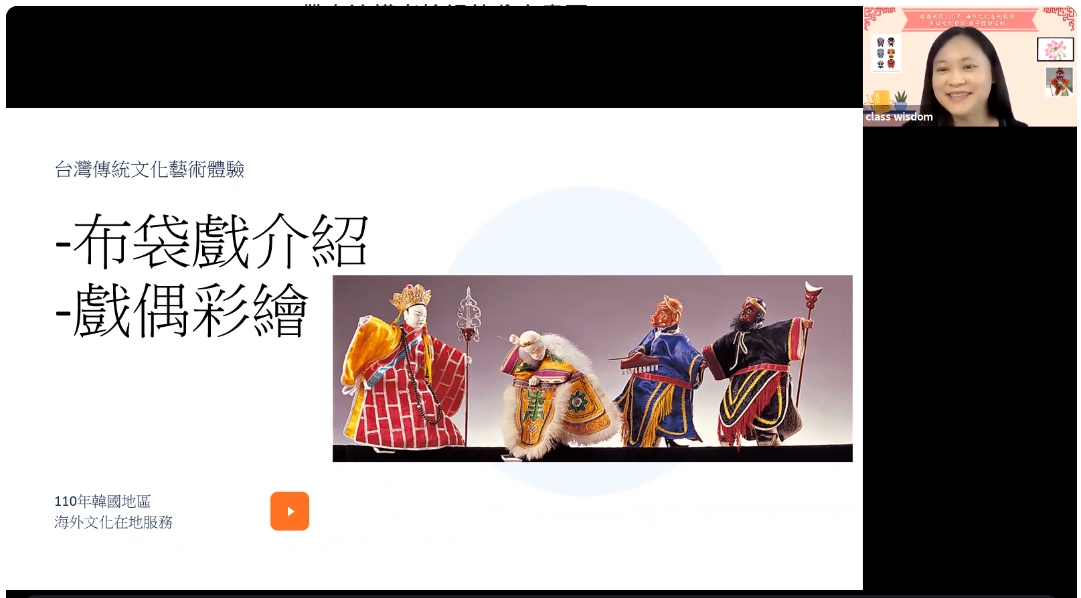 許智華表示,前年民俗文化在地服務活動,是結合僑團舉辦的國慶盃籃球賽辦理,在會場設置攤位,除了有布袋戲觀賞和介紹、傳統服飾體驗外,還有扯鈴、捏麵人、釣瓶子等童玩體驗,讓參賽同學與僑胞體驗臺灣的民俗文化。今年因受新冠肺炎疫情影響,改在線上辦理,大家手中的國劇臉譜與布袋戲偶,是僑委會為支援海外文化推廣及教學活動特地從臺灣採購寄來的。