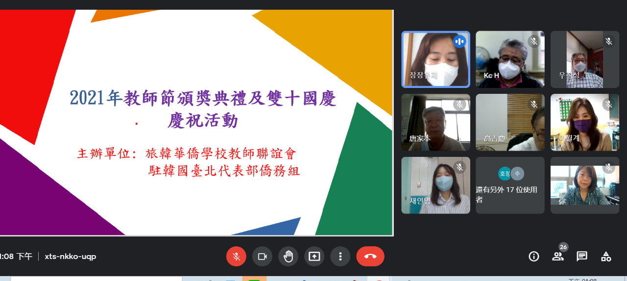 「旅韓華僑學校教師聯誼會」及駐韓國代表處僑務組共同舉辦慶祝110年教師節線上頒獎典禮及雙十國慶活動