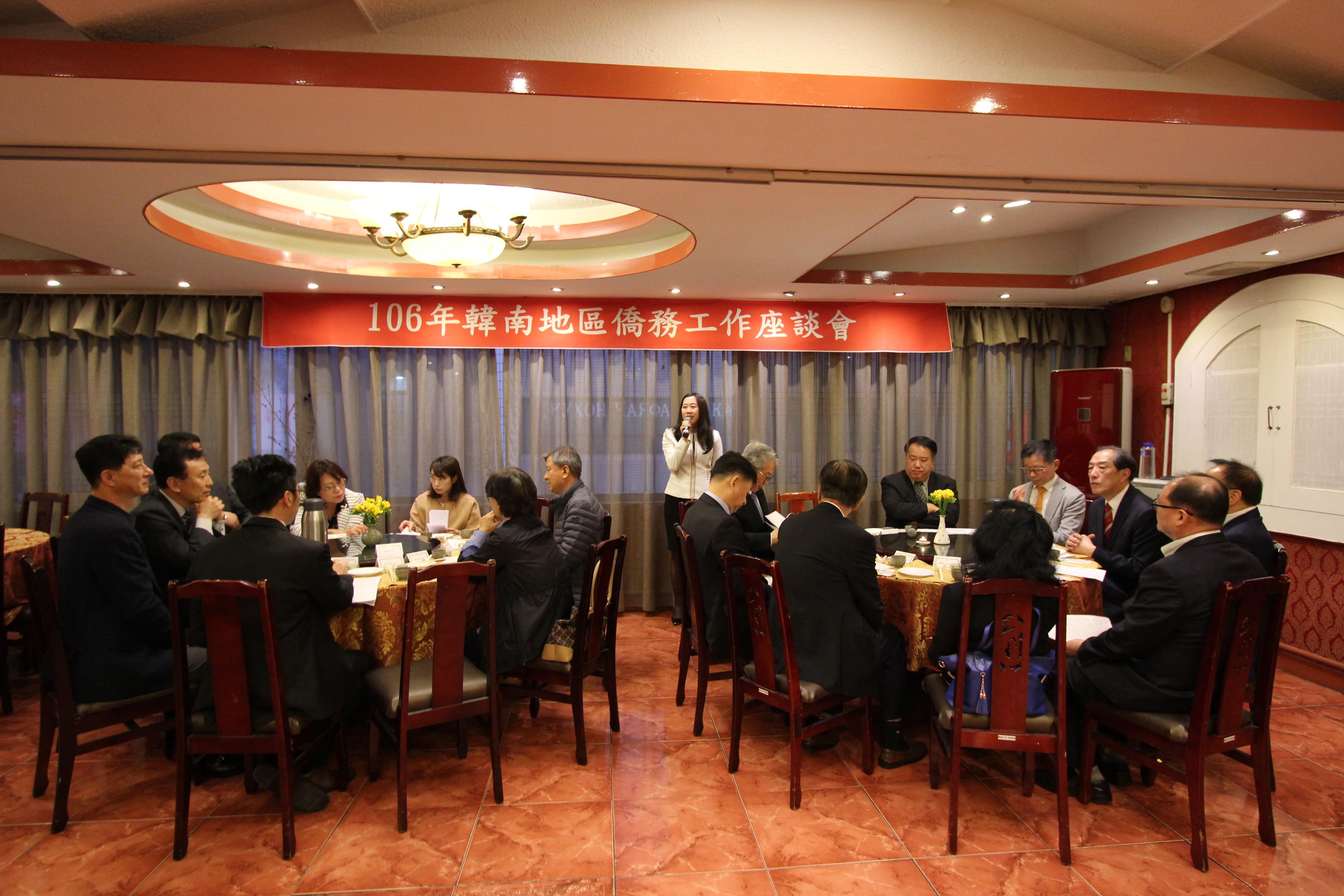 會議首先由主席駐釜山辦事處吳處長致詞,續由韓國赴台與會代表僑務委員叢湧滋致詞。本次座談主要議題為「海外僑校永續發展」,亦提及僑胞所關切之身分議題。