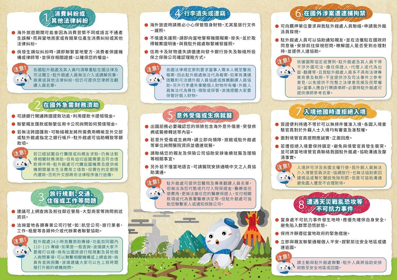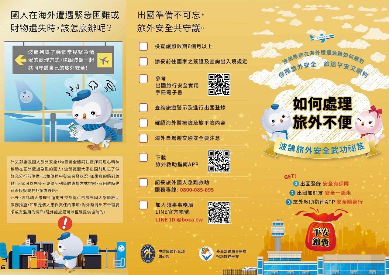 為提供國人旅外急難救助服務多元管道,外交部領事事務局已設置LINE官方帳號(ID:@boca.tw)及「旅外救助指南」APP,國人可以前述數位工具,及時接收外交部發布之旅遊警示,亦可查詢包括申辦(補發)護照、出國登錄、前往國家之簽證及旅遊資訊、駐外館處連絡資訊、在海外遭遇急難之應對方式、洽助翻譯及旅外保險等資訊,有助於旅外國人維護自身安全,請國人多加利用。