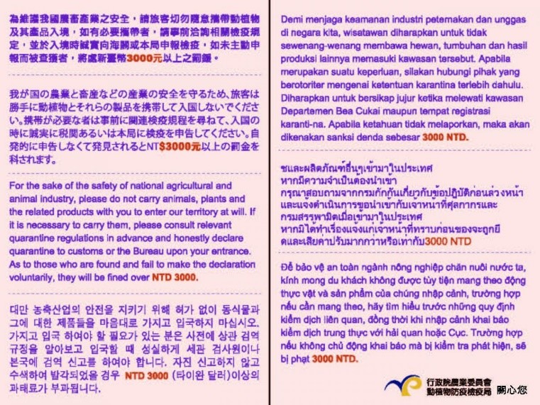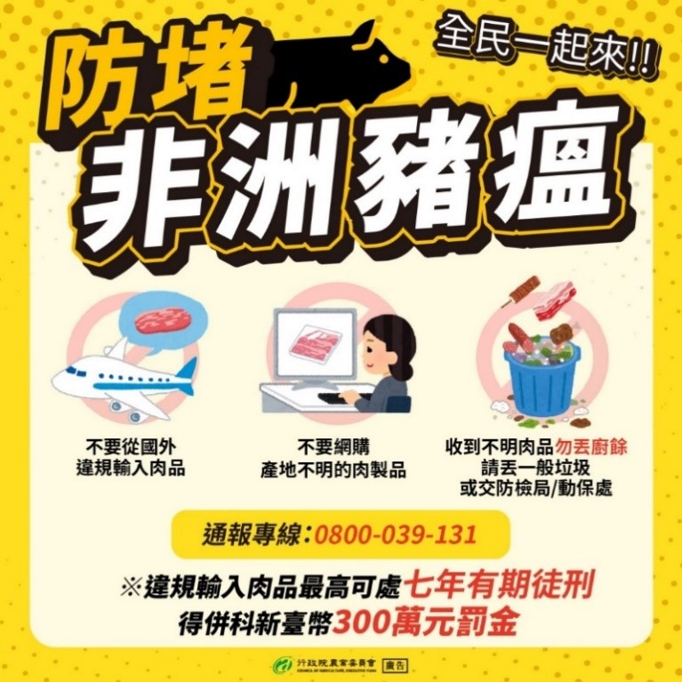 年關將近,提醒旅客入境台灣時勿攜帶動植物或其產品,或郵寄豬肉製品入台,以免觸法受罰。非洲豬瘟致死率100%,違規攜帶肉類產品入境,如肉鬆、香腸、生鮮豬肉、臘肉、燕皮等,最高將處以新台幣300萬元罰鍰。