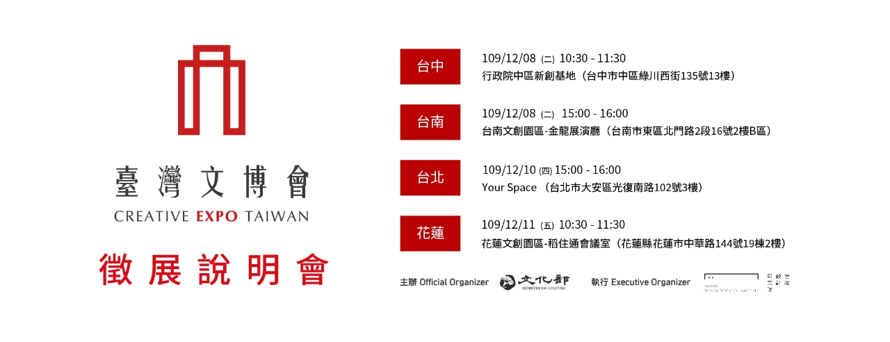 一、「臺灣文化創意設計博覽會」(簡稱臺灣文博會)自99年起辦理,為國內最具規模及代表性之文創博覽會,108年總計25國參與、573家國內外廠商參展,吸引超過35萬人次參加,預估交易額達新臺幣6.5億元。 二、「2021臺灣文博會」訂於110年4月16日至110年4月25日假華山文創園區、松山文創園區及花博公園爭艷館辦理,其中松山文創園區及花博公園爭艷館以商展為主,分別策劃設計品牌館、圖像授權館,展期為110年4月21日至25日共五天,將徵集相關文創業者共同展出。 三、前開徵展自即日起至110年1月18日止受理報名(早鳥優惠至110年1月4日止),請協助宣傳週知,並廣邀國內外文創業者 參 加 , 相 關 資 訊 請 至 臺 灣 文 博 會 官 網(http://www.creativexpo.tw)查詢,或逕洽執行單位財團法 人台灣設計研究院臺灣文博會小組02-2745-8199轉579、 640或 628(圖 像 授 權 ), 電 子 信 箱 :info@creativexpo.tw。 「2021臺灣文化創意設計博覽會」徵展簡章英文