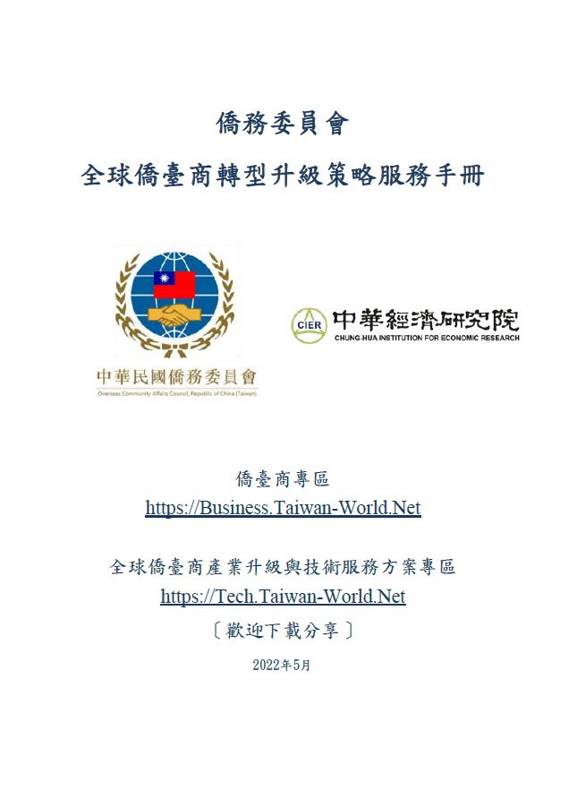 僑委會彙編之《全球僑臺商轉型升級策略服務手冊》置於官網「僑臺商專區」(https://Business.Taiwan-World.Net) 及「全球僑臺商產業升級與技術服務方案專區」(https://Tech.Taiwan-World.Net),歡迎海外僑臺商朋友下載運用並踴躍分享。期盼運用中經院提供的相關資源,提升全球競爭力及發展事業版圖,同時發揮僑臺商企業之影響力,將臺灣產業技術及創新能量推廣至國際舞臺。